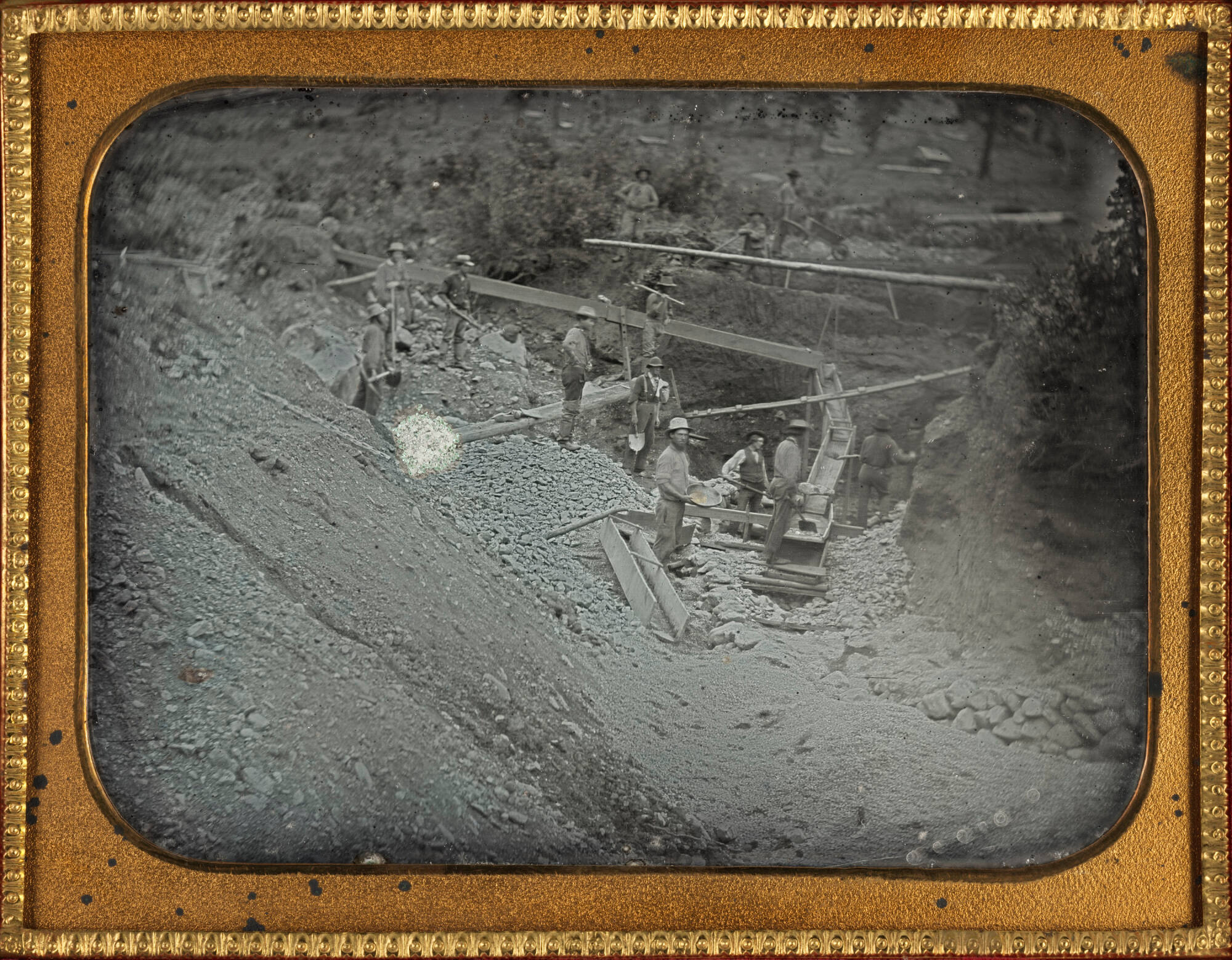 DescriptionImage of men working along sluice box in a rocky valley. The wooden trough emerges horizontally from an excavated tunnel on the side of the hill. The men all wear long pants, shirts and hats while holding various implements: pickaxes, shovels, etc. A man in the foreground displays a pan partially filled with gold. This half plate daguerreotype is housed in a brass mat inside of a decorative paper-covered wooden case with a red velvet liner.ProvenanceThe Hall Family Foundation, Kansas City, MO, 2018;