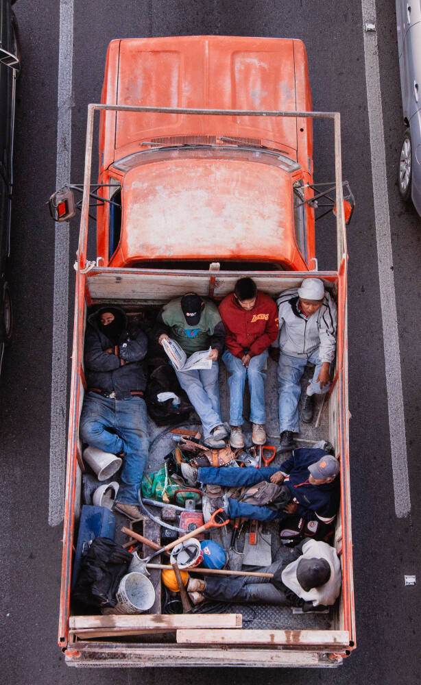 DescriptionImage taken from above of six men in the bed of a faded orange truck. The men are wearing jeans and work boots. The truck bed is filled with shovels, buckets, hard hats, and other tools.Gallery LabelFor one year, Alejandro Cartagena photographed construction workers riding in the back of pickup trucks from their homes near Monterrey, Mexico, to their jobs in San Pedro, Mexico. The commute averages between 45 and 90 minutes each way. Looking down from an overpass, Cartagena made bird’s eye views of the trucks that carried men as they sat or slept amid their equipment. The workers, who lived in new suburban developments far from public transportation, relied on these daily carpools. Cartagena saw in these men a willingness “to do whatever it takes to own a house but still go to the city, where there is work.”
