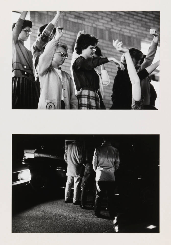 DescriptionTwo photographs mounted vertically on a single mount. Top image is of a group of young women with their arms raised. The bottom image is of three men standing next to a car at night with their backs towards the viewer; headlights from another vehicle light the area where they stand.Provenance