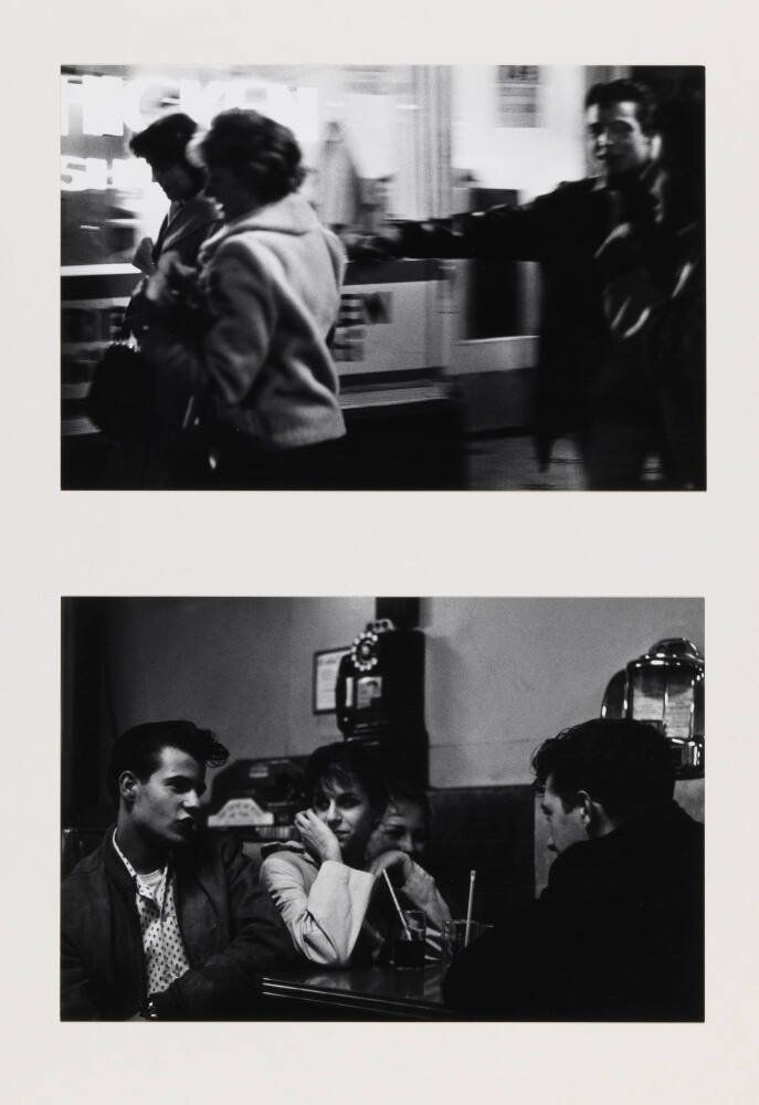 DescriptionTwo photographs mounted vertically on a single mat. The top is a blurry image of several young people in coats walking down the sidewalk in front of a neon shop sign. The bottom image is of several young people seated in a diner with a small jukebox above their table.Provenance