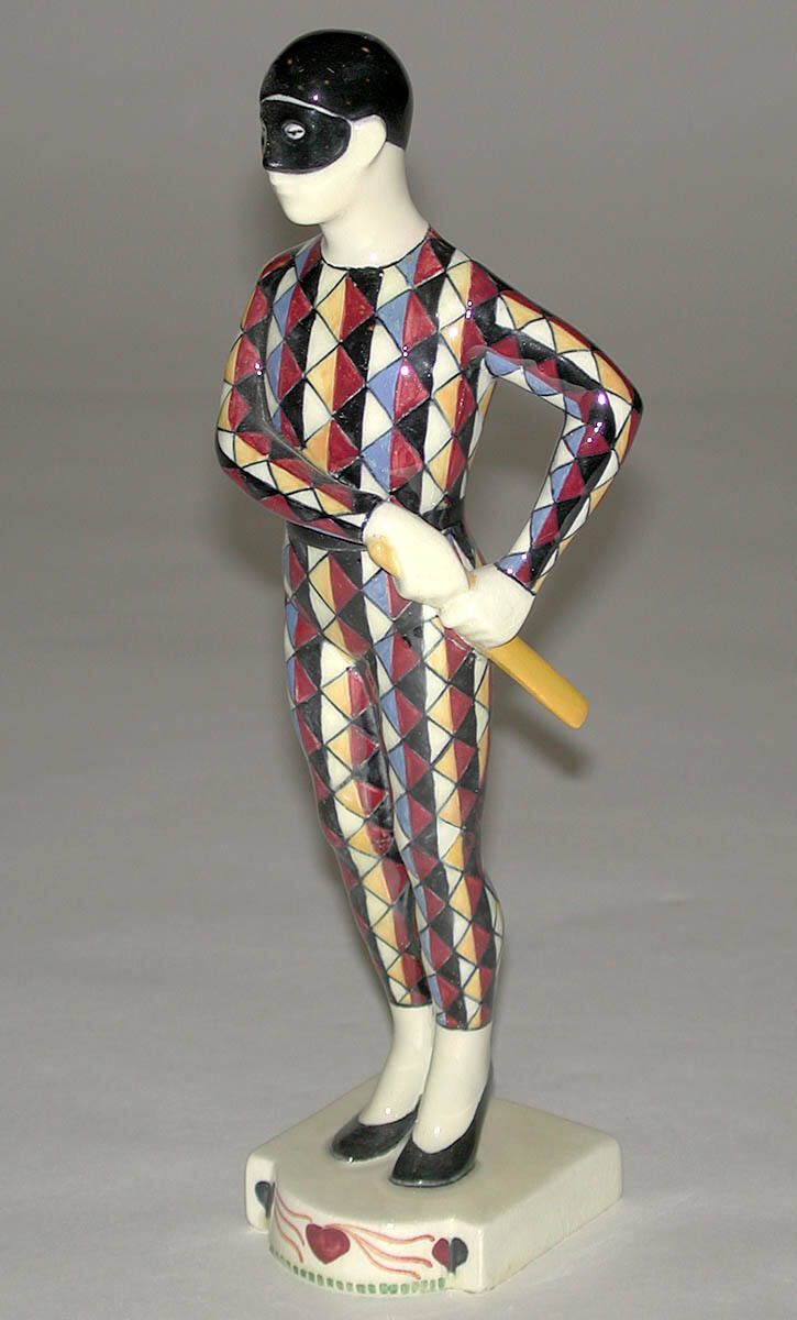 DescriptionMale figure wearing black skull cap and mask, multi-colored patchwork suit, black shoes; stands on small white base decorated in front with red and blue hearts; left hand holds slapstick at waist also trasped by right hand; bottom: 514/466 EW.