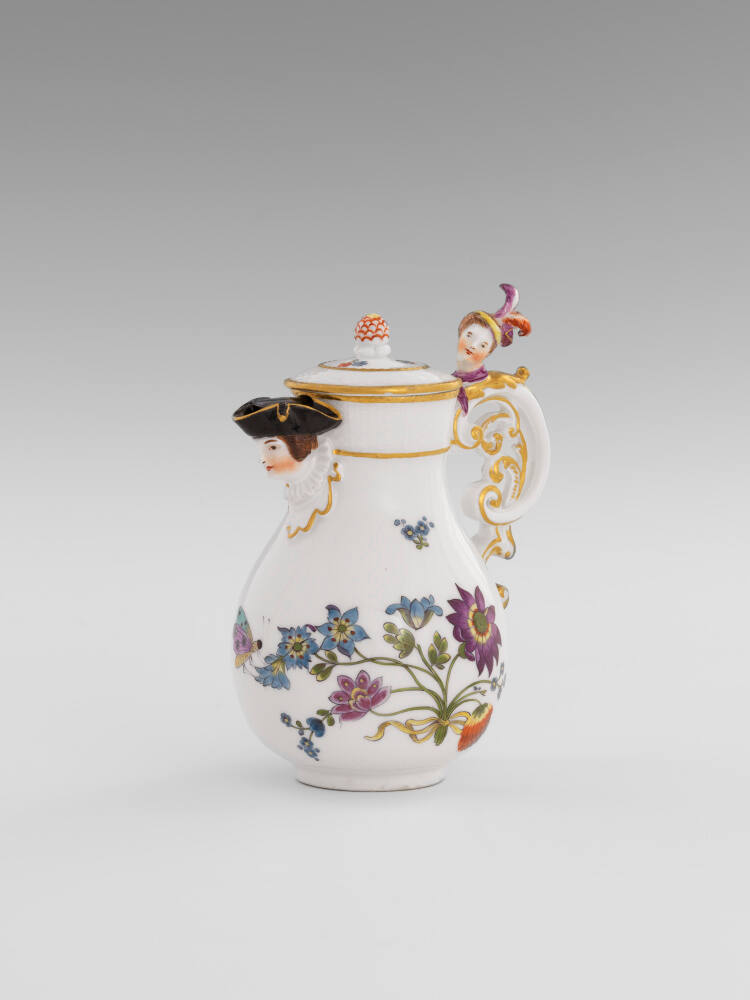 [1] This object is one of two small jugs included in this sale as part of lots 2247-2260, Service, Meissen, 1735-1740. Lots 2247 and 2248 are described as Zwei Kaffeekännchen. Birnenform mit Deckel und Schnabelausguss in Form eines Frauenkopfes mit weisser Halskrause und schwarzem, goldgerändertem Dreispitz. Die Henkelfigur mit buntel Federbusch. H=je 16 cm [Two small coffee pots. Pear-shaped with lid and spout in the form of a woman's head with a white neck ruff and a black, gold-trimmed tricorn hat. The handle figure wears a colorful plume. Height = 16 cm each]. The jugs are illustrated in plate 21 of the sale’s catalogue. A visual comparison of the plate and a contemporary photograph suggests lot 2247 is most likely the Nelson-Atkins jug.