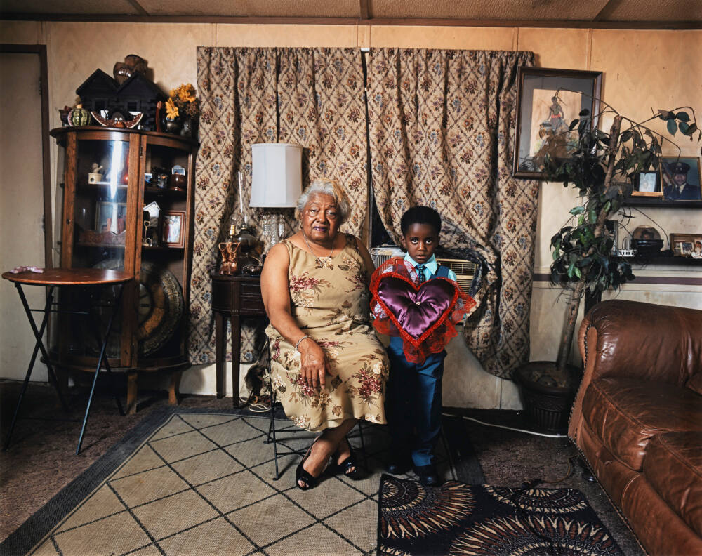 DescriptionImage of gray-haired woman wearing sleeveless floral dress seated in a folding chair next to young boy dressed in a suit while holding a pink and red heart-shaped pillow with a ring tied to the center; neither are smiling. They are in front a curtained window next to a glass front cabinet, floor plant, and brown leather sofa.Gallery LabelA regal older woman sits in a folding chair next to a dapper attendant, both posing before Deana Lawson’s camera like grandmother and grandson. Lawson’s photographs have the appearance of snapshots, or photos found in a family album, but are in fact highly staged images populated mostly with strangers. She composes her subjects and settings, often rearranging personal belongings and directing poses.