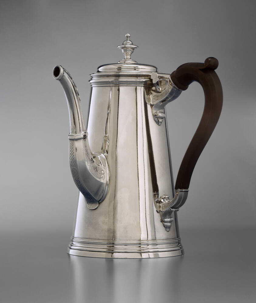 DescriptionSilver coffee pot with a tapered body that is plain except for engraving on the spout and lid. The spout is octagonal on the lower half, with 3 sections ornamented with engraving. The upper half of the spout is tubular and comes to a blunt end. An applied leaf covers the upper surface of the spout. The spout is positioned at 90 degrees from the octagonal wood handle. The hinged cover has a low dome around which an engraved band surrounds a turned vase finial. Both front and base are engraved with the intials GCB.Gallery LabelThe subtle yet elegant chased designs of foliage, shells and trelliswork ornamenting this coffee pot indicate the sophisticated and refined craftsmanship of Paul de Lamerie's workshop, the largest in London. The pot is made from Britannia silver, a higher grade of silver required from 1697-1720. Sterling silver is 925 to 1,000 parts pure silver, while Britannia is 958.4. Lamerie's insistence on using the more costly standard of silver for 12 years after it was obligatory provided a higher grade and thus a more malleable silver for his intricate designs, such as those on the handle and spout.