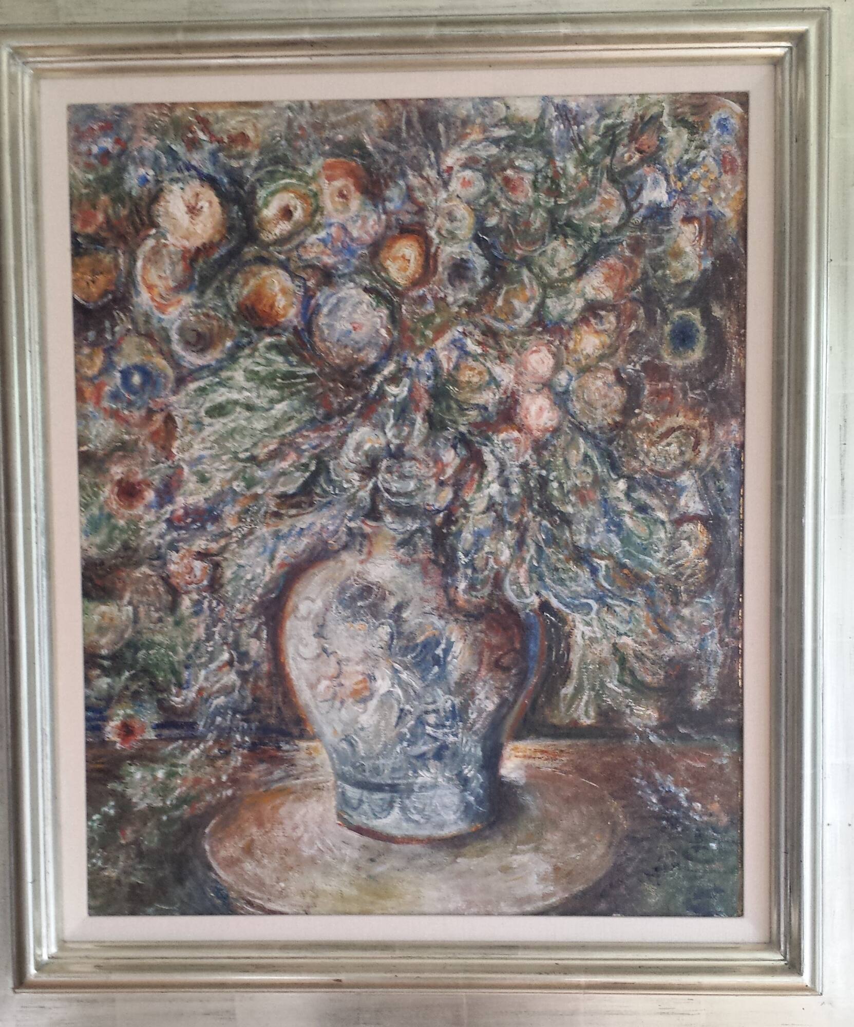 DescriptionThis is a vertically oriented painting depicting a bouquet of flowers in a mostly blue and white ceramic vase that rests on a small, round tabletop. The flowers and greenery of the bouquet appear to spill out of the vase and they extend upward to fill the upper half of the canvas. The vegetation is painted imprecisely in a somewhat impressionistic manner. The blossoms are circular, many of them composed of concentric circles of varying colors. There are blues, greens, pinks, oranges, and browns used throughout the painting, none of them highly saturated colors. White highlights appear throughout.Gallery LabelPainted on the artist’s 55th birthday, this exuberant still life, donated by the president of the Albert Bloch Foundation, bursts from the canvas. The profusion of blossoms and the vase from which the flowers explode were gifts to Albert Bloch from Anna Sylvia Francis, whom he would marry in 1951. This birthday bouquet could be interpreted as both a painted celebration of another year and as a symbol of a budding relationship that would bring great happiness. The Mexican stoneware vase that originally held the bouquet is on view nearby.