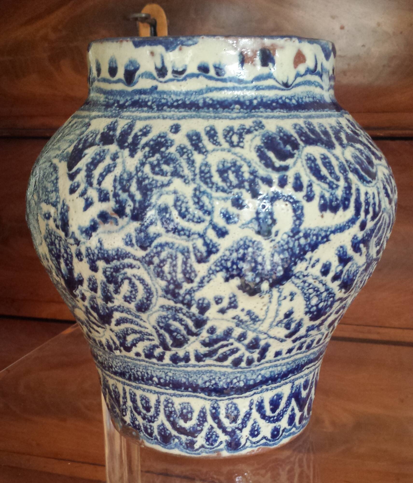 DescriptionThis is a blue-and-white glazed ceramic vase. Its decoration and shape divides it into three sections. The upper section, the neck, is cylindrical. There is a solid blue band of glaze where the neck meets the body of the vase. The body is roughly the shape of an upside down pear–broad at the top and narrowing toward the bottom. It tapers into a cylindrical foot, set off by another band of blue glaze. Each of the three sections is decorated with a different blue-on-white design. The designs on the opening and the base are abstract, and the design on the body mostly resembles a leafy vine.ProvenanceAnna