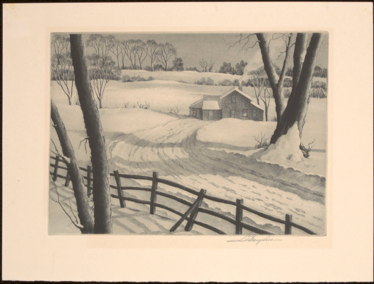 DescriptionWinter landscape with house in middleground, snowy lane curving towards it from foreground. In foreground, left side, tree and fence extending left to right.