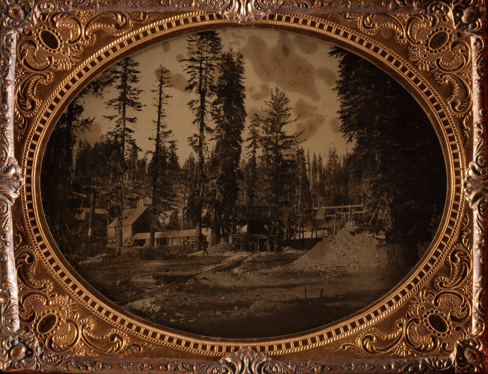 DescriptionImage of wood structures in a heavily forested area. A group of men work with pick axes and shovels at the base of a wooden structure. This half plate ambrotype is housed in a brass mat inside of a Union case with a purple velvet liner. The cover of the case depicts a woman riding a bull with a man standing next to her and holding her hand.ProvenanceThe Hall Family Foundation, Kansas City, MO, 2017;