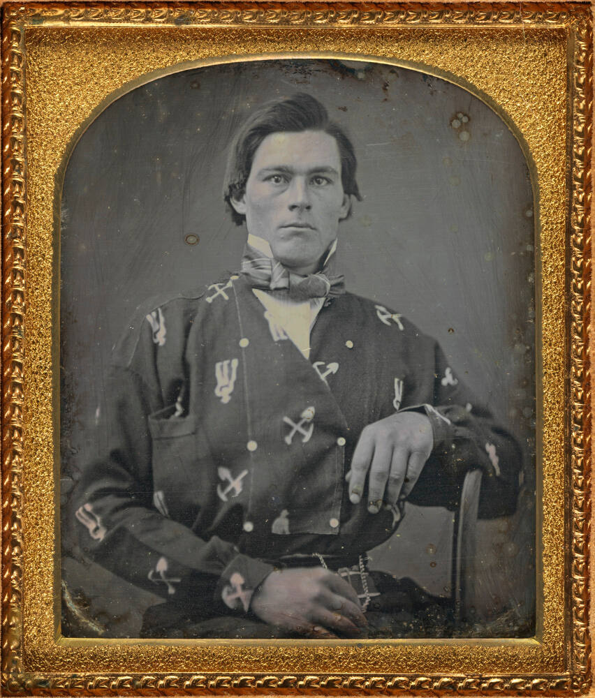 DescriptionImage of man wearing a bow tie and patterned jacket adorned with with images of pics and shovels. He's seated with his left arm resting on the chair back. His hair is parted on the side and covers the tops of his ears. This sixth plate daguerreotype is housed in a brass mat inside of a Union case with a red velvet liner. The case is adorned with small flowers and abstract designs.Provenance