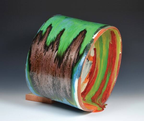 DescriptionA large cylindrical earthenware sculpture with highly colored glazes in red, orange, green, blue, purple, white, and brown with gloss, matte, and metallic finishes. The glazes are poured, dripped, smeared, and dribbled around the exterior and interior surfaces. A pool of glaze appears to spill out of one side of the cylinder’s edge at its base. A small rectangular earthenware brick at the bottom of the cylinder with a top layer of glaze elevates one side of the work. The piece bears the artist’s signature “Mabry” on the bottom in blue matte underglaze.Exhibition HistoryPassages, Belger Crane Yard, Kansas City, Missouri, February 6-April 18, 2015.