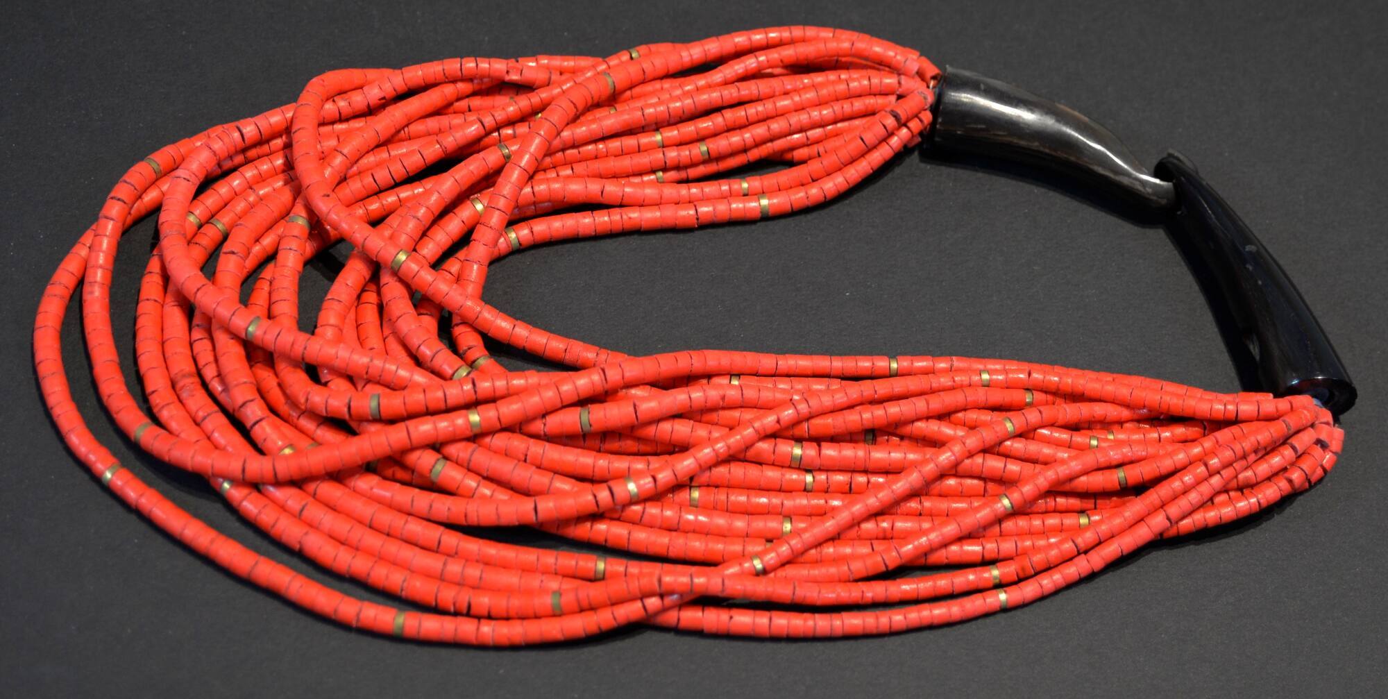 DescriptionNumerous strands of red shell beads, gathered with cones at the top to be worn as a necklace.