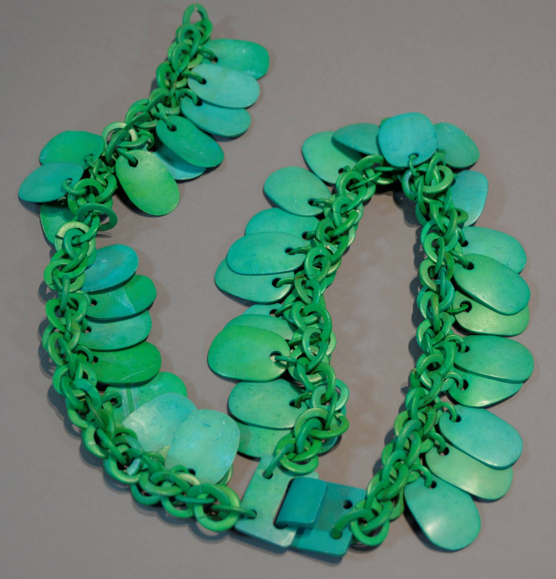 DescriptionA green chain necklace with flat ovals haning from the chain in a line.