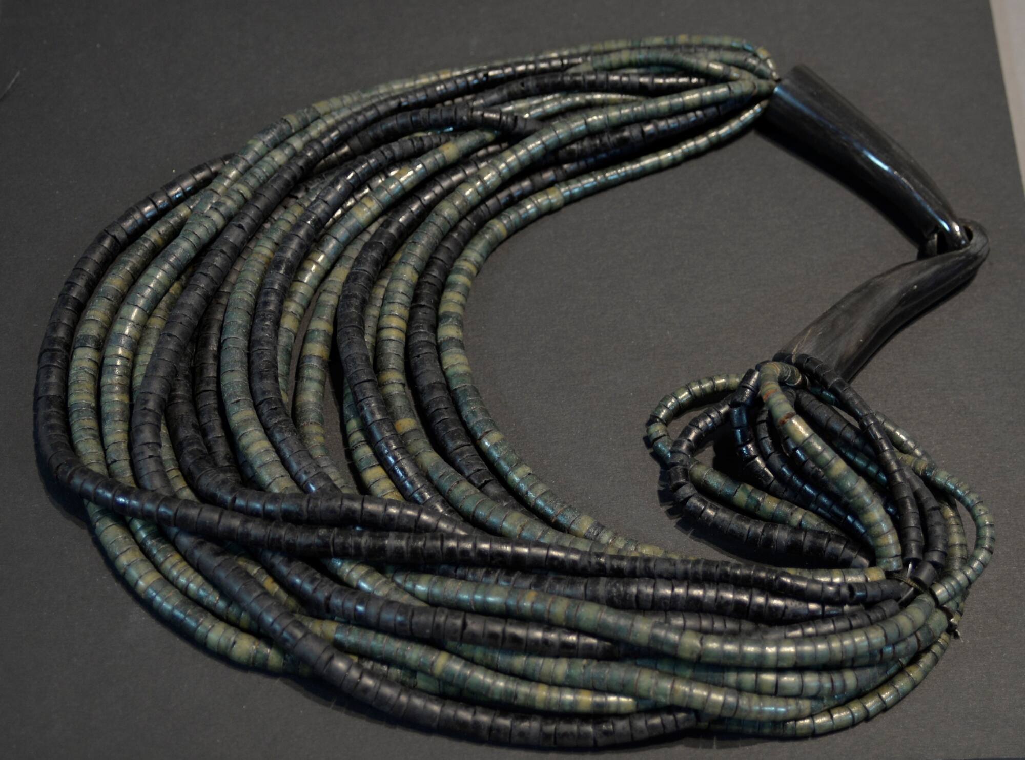 DescriptionNumerous strands of grey shell beads, gathered with cones at the top to be worn as a necklace.