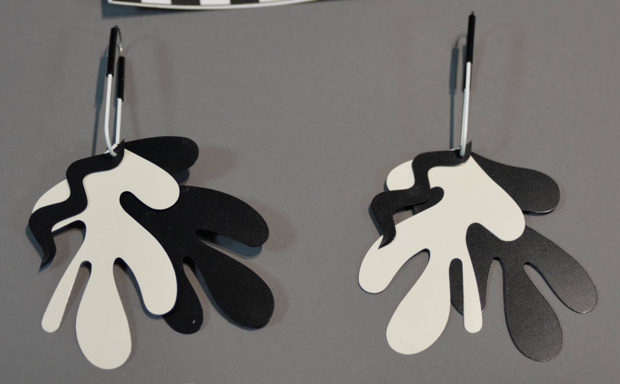 DescriptionAbstracted leave shapes in black and white, connected with a rectangular metal clip.