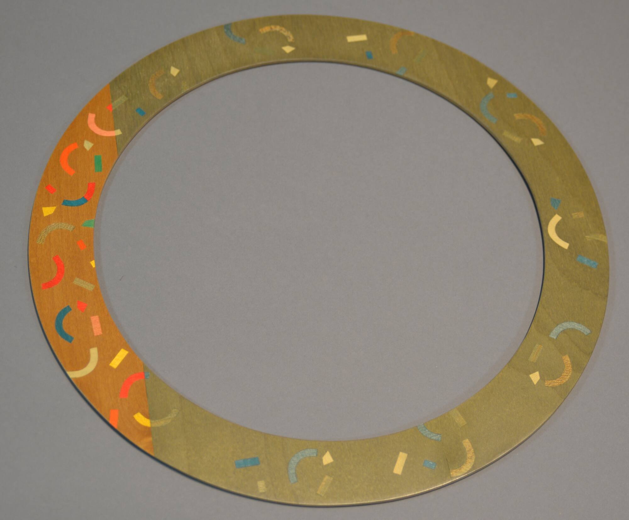 DescriptionA flat circular band of marquetry wood with allover curved confetti in primary colors. Three-quarters grass green and other remainder wood colored.