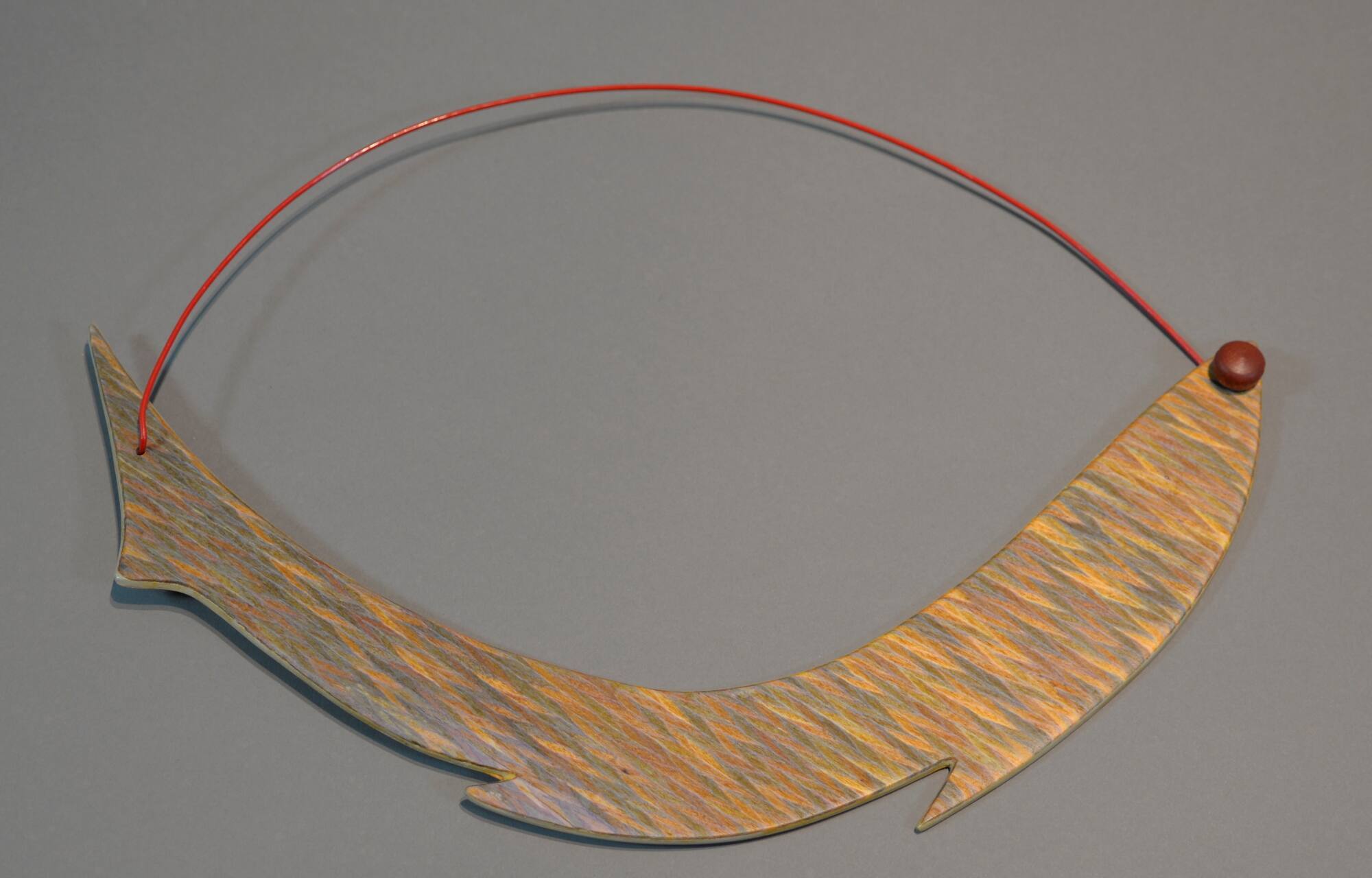 DescriptionA fin shaped wooden pendant in stained natural colors of yellow and green attached to a red plastic wire to make a necklace.