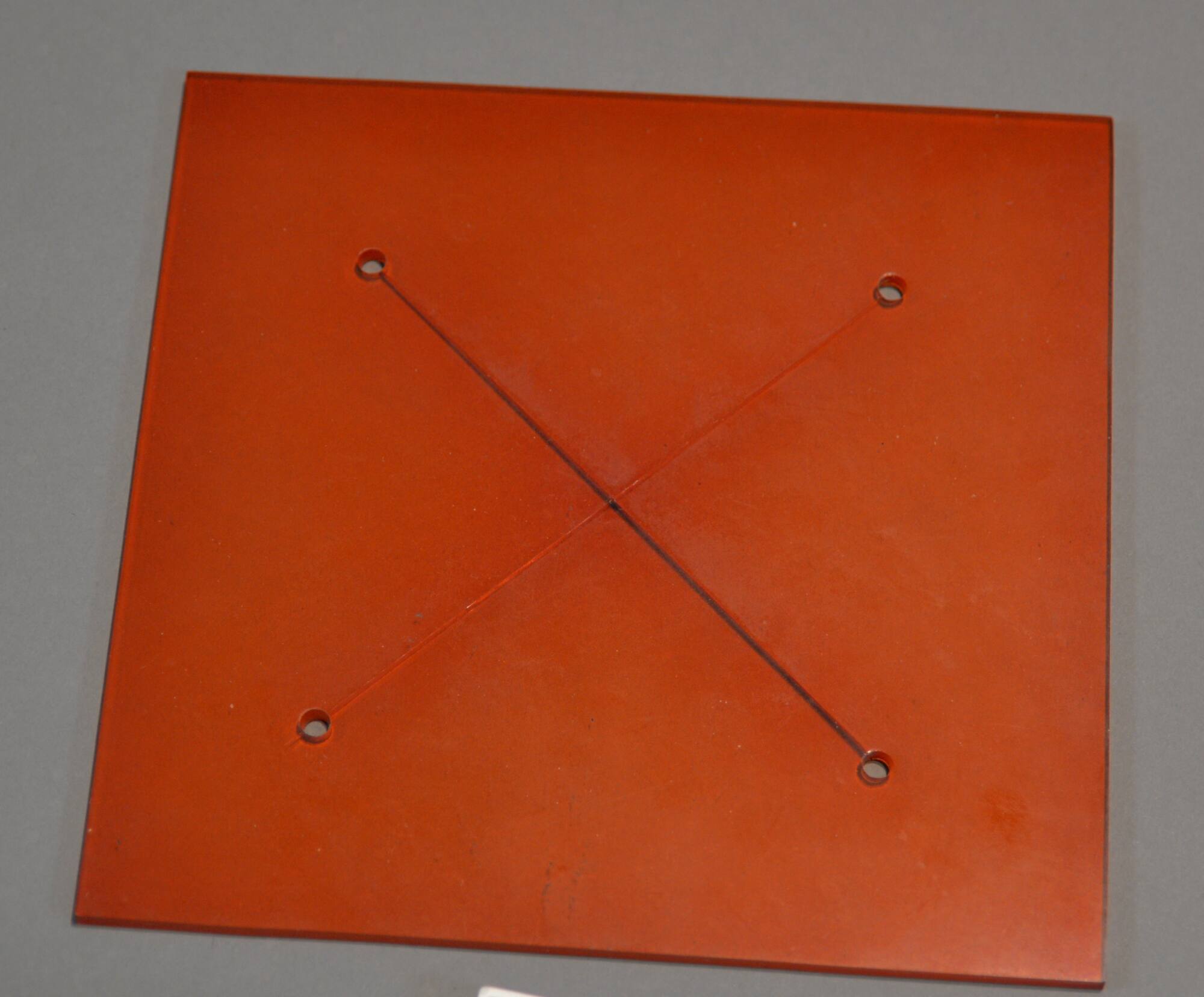 DescriptionA flat reddish-orange plastic square with X-shaped slits.