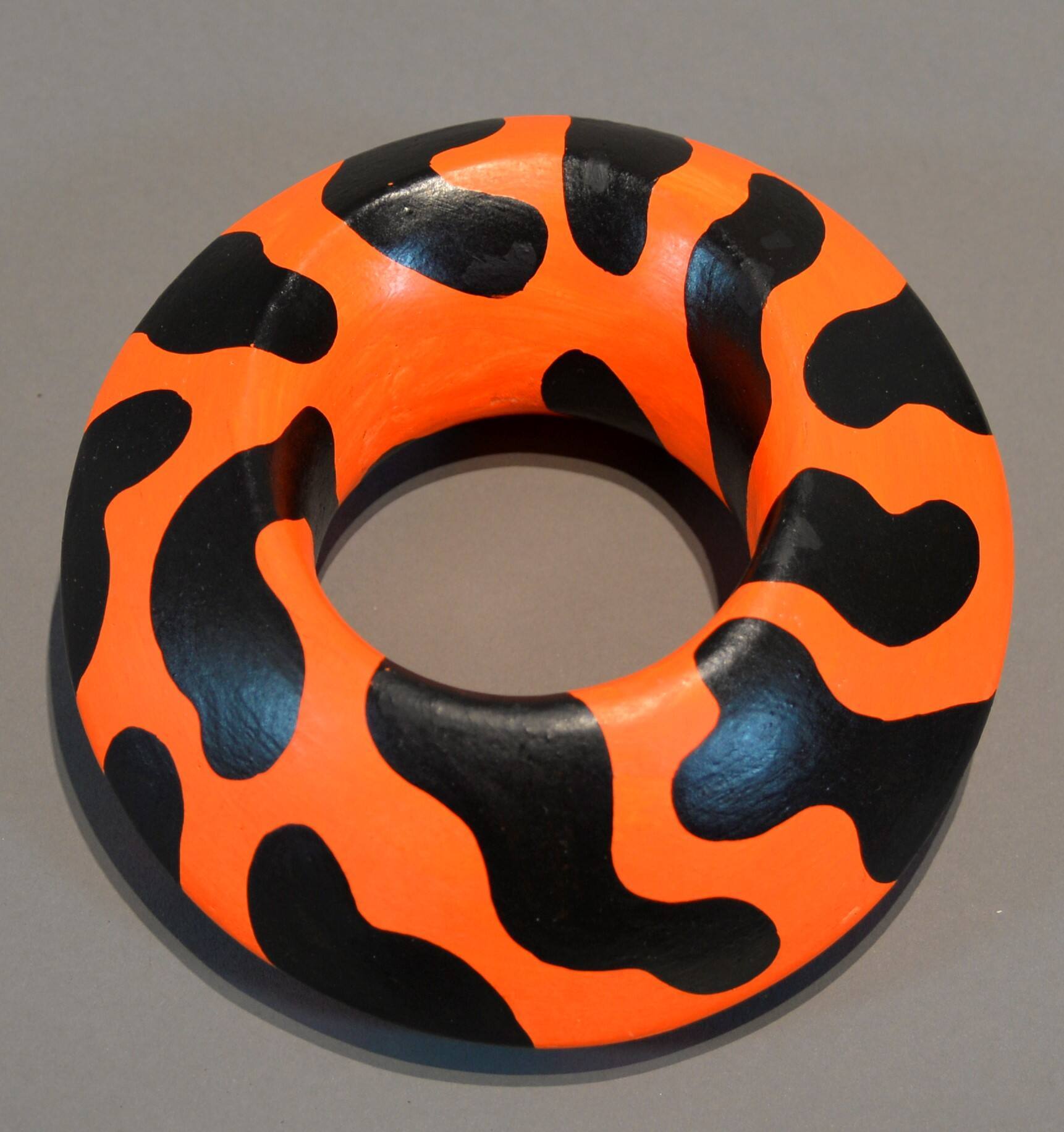 DescriptionCircular wood bracelet painted orange with black organic shaped stripes.