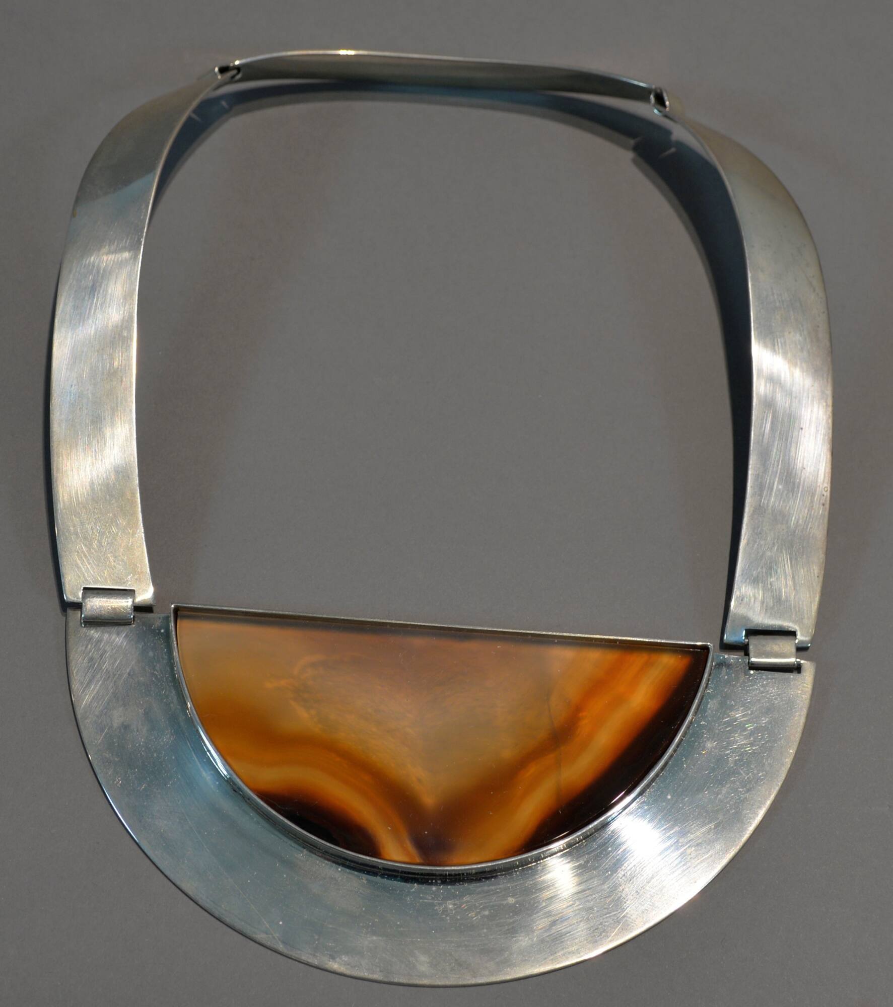 DescriptionA necklace of 3/4 inch wide slat silver band, with a central half-circle agate pendant, like a bib.