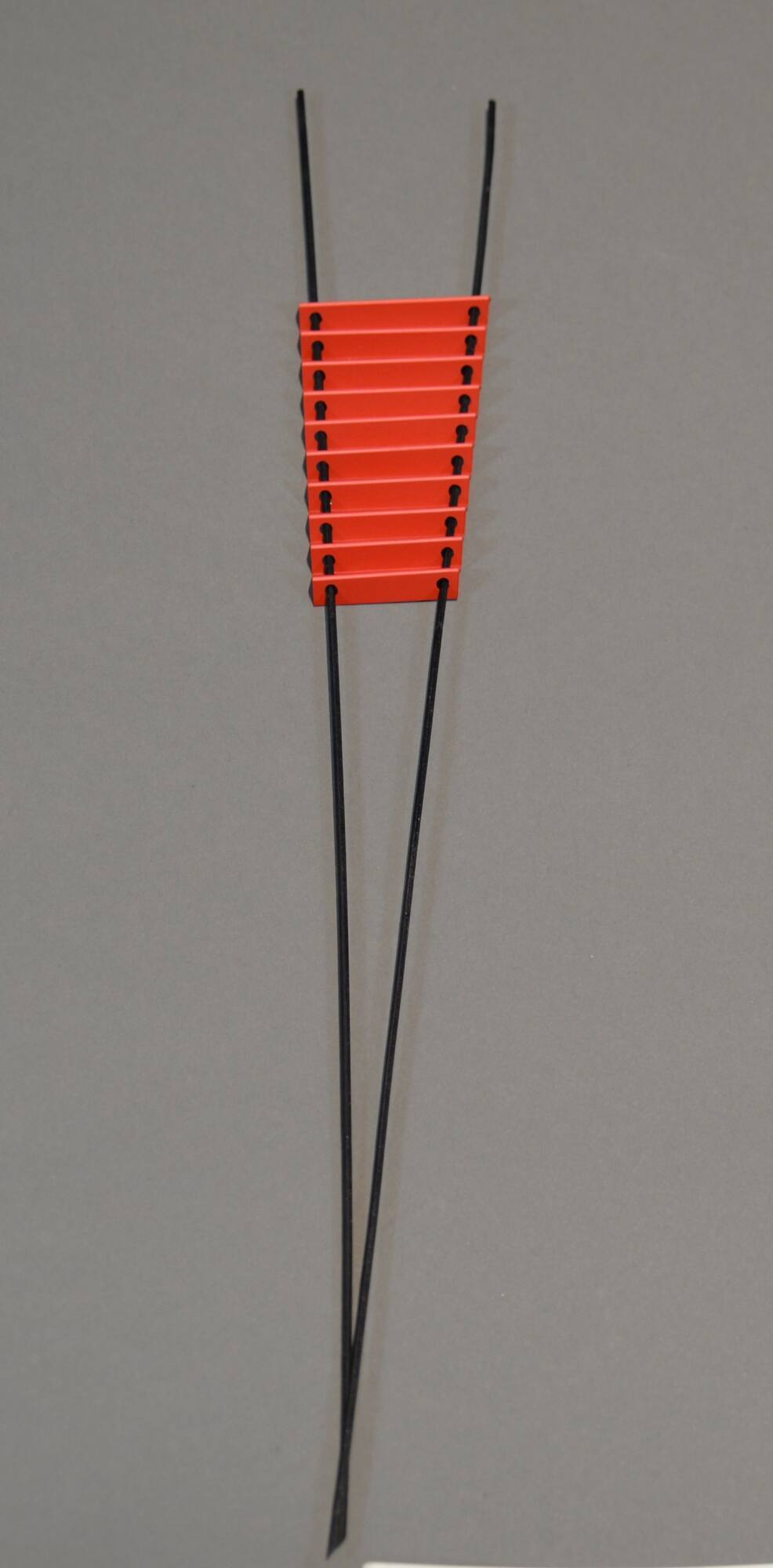 DescriptionTwo wood rods meet at one end to form a V-shape. The rods are laced through red paper in an accordian fold.Copyright© Paul Derrez