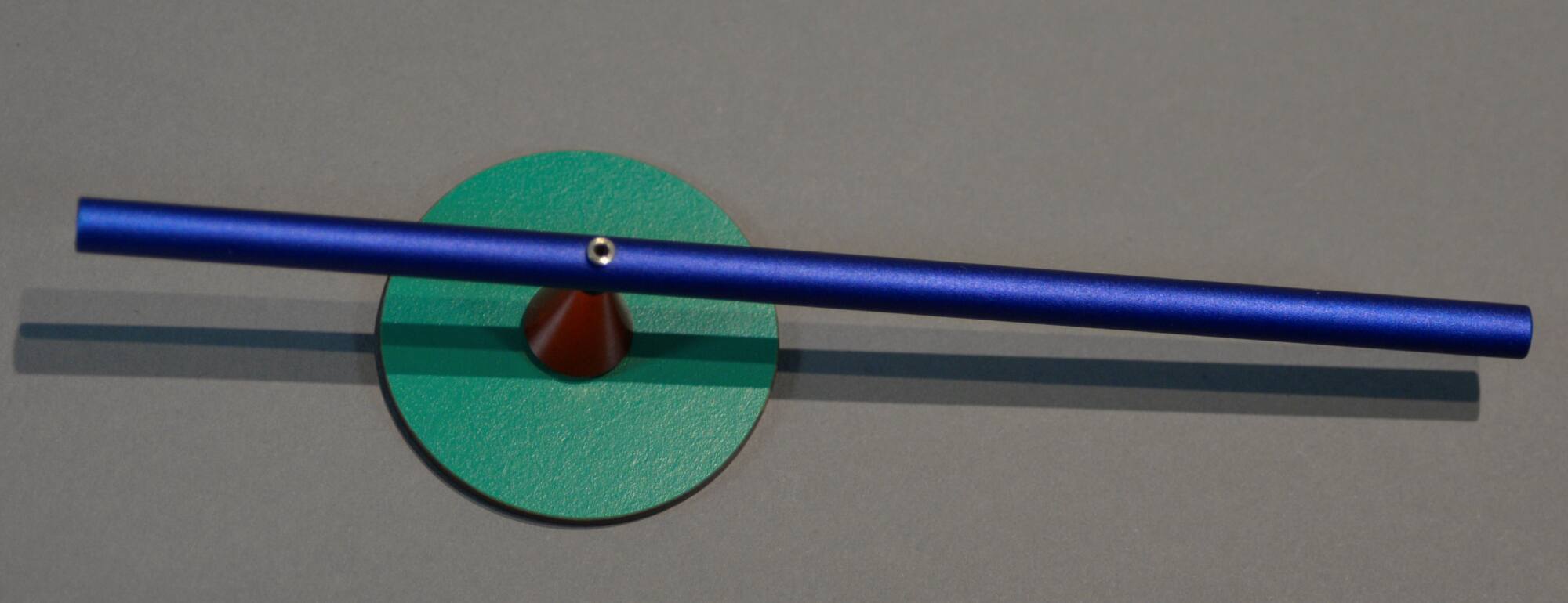 DescriptionGreen circle with a red cone in the center topped with a blue rod laying horizontally across the top.The rod is mobile and can spin.