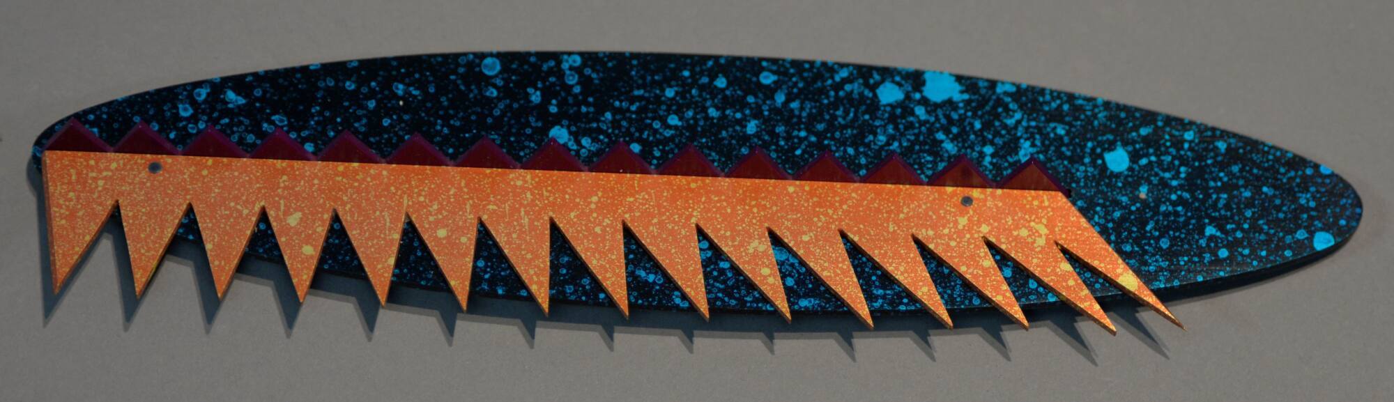 DescriptionA metallic blue ellipse with protruding copper colored metallic, jagged zigzag fin.Copyright© Billie Jean Theide