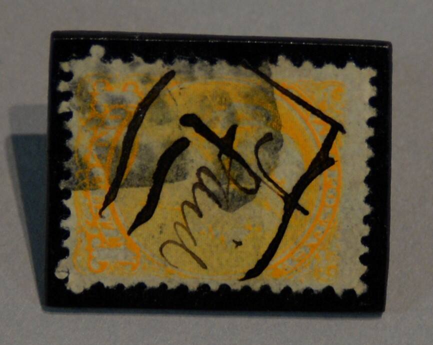 DescriptionA pin made from a yellow postal stamp.