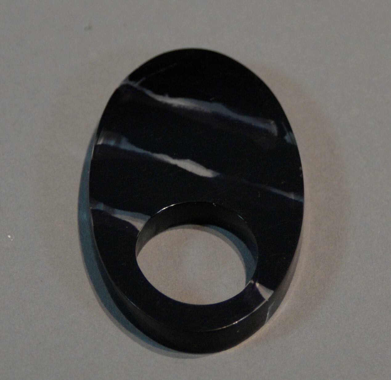 DescriptionFlat, oval shaped black plastic ring with clear streaks.