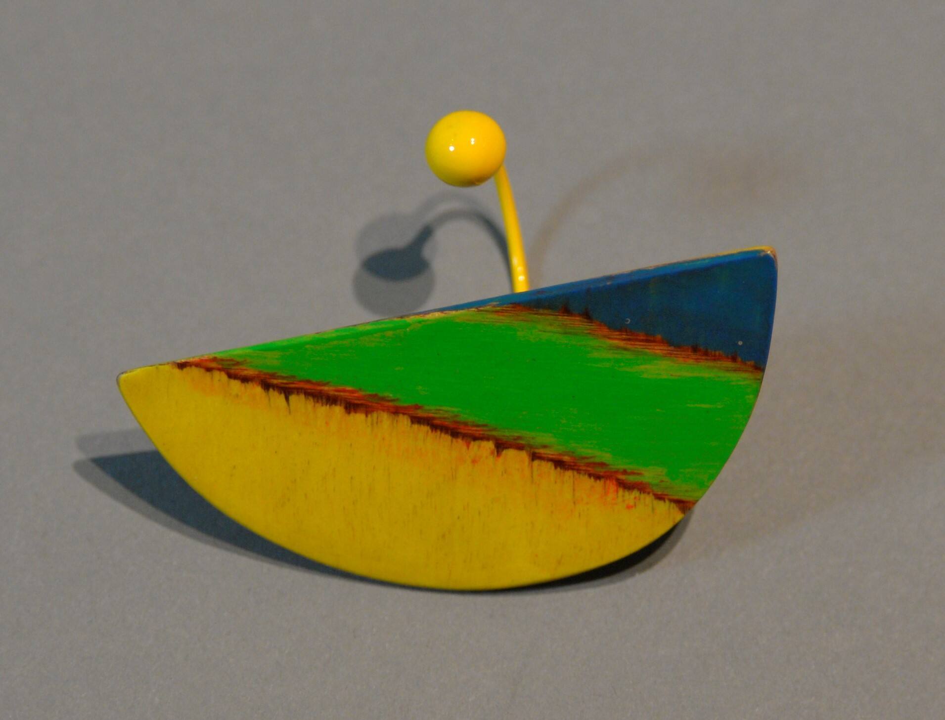 DescriptionA yellow right topped with a flat semicircle with thick blu, green and yellow sections separated by thin red lines.