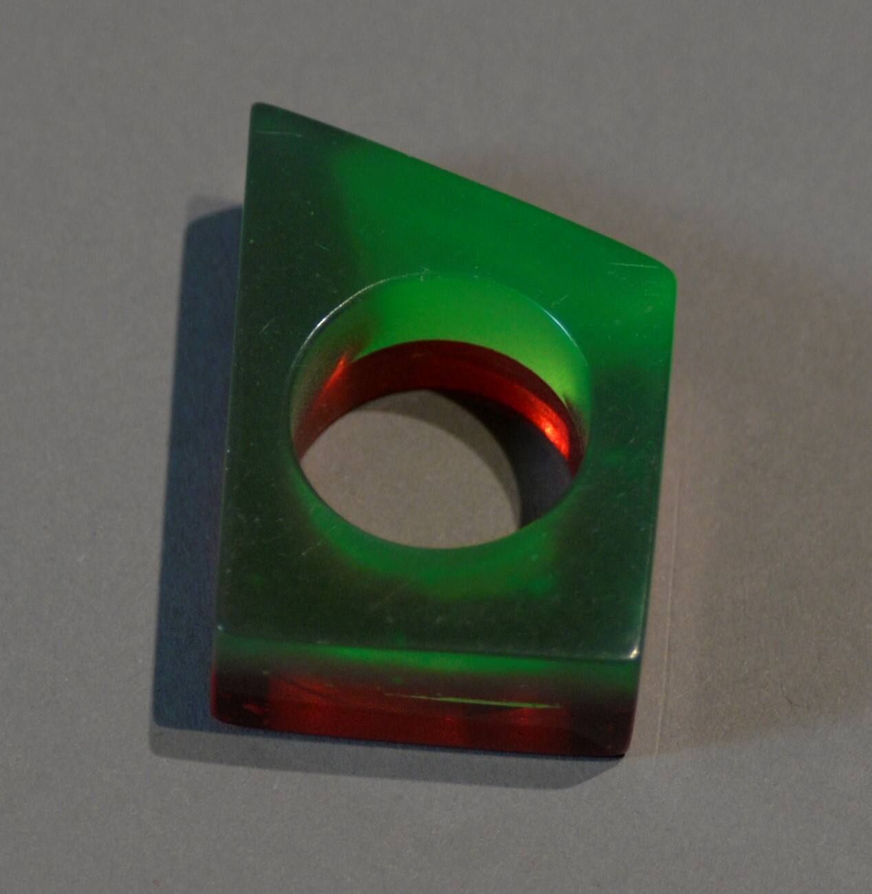 DescriptionTrapezoidal plastic ring. The ring is split vertically into two different colors, one half green and the other pink.Copyright© Estate of Marjorie Schick
