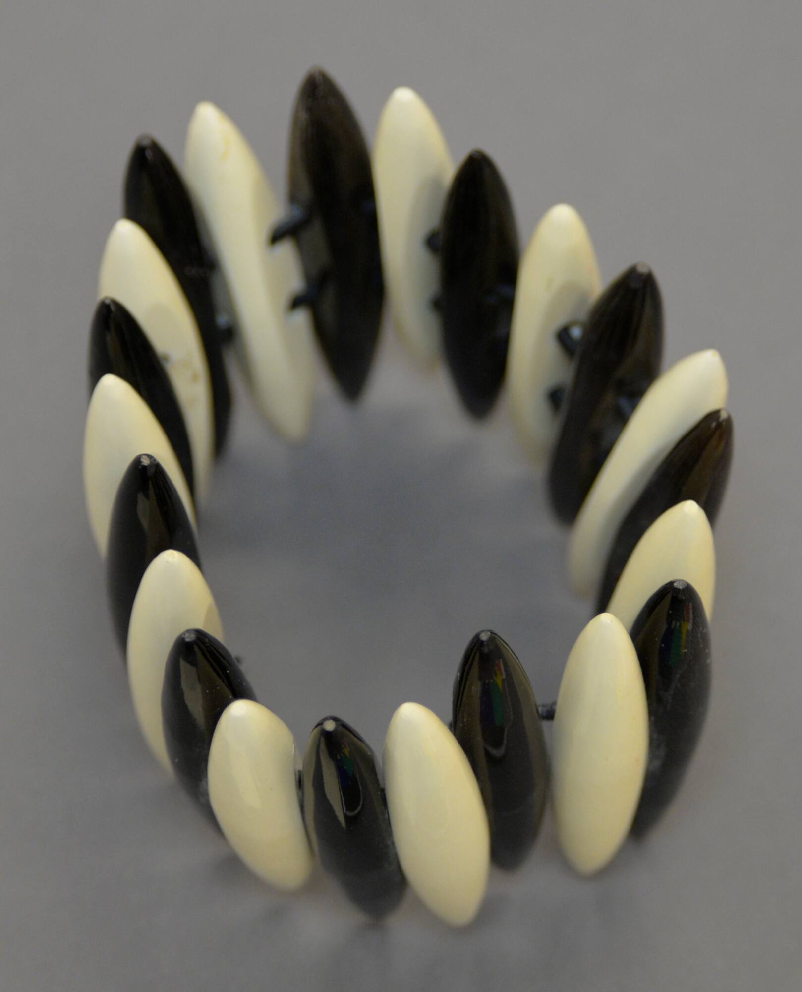 DescriptionA bracelet made with alternating black and white elongated ovals.