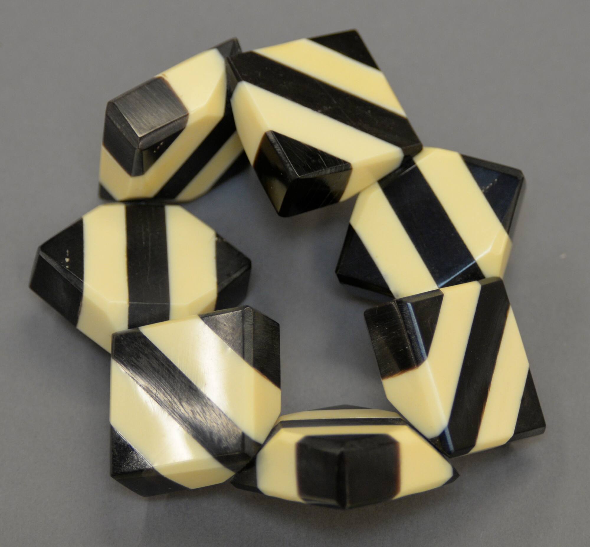 DescriptionSeven black and white striped squares attached with cord.