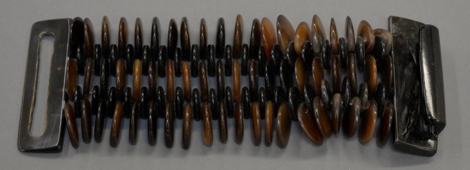 DescriptionA ladder-like structure of rectangular slats made of brown and black horn with rectangular clasps on each end to create a cuff.