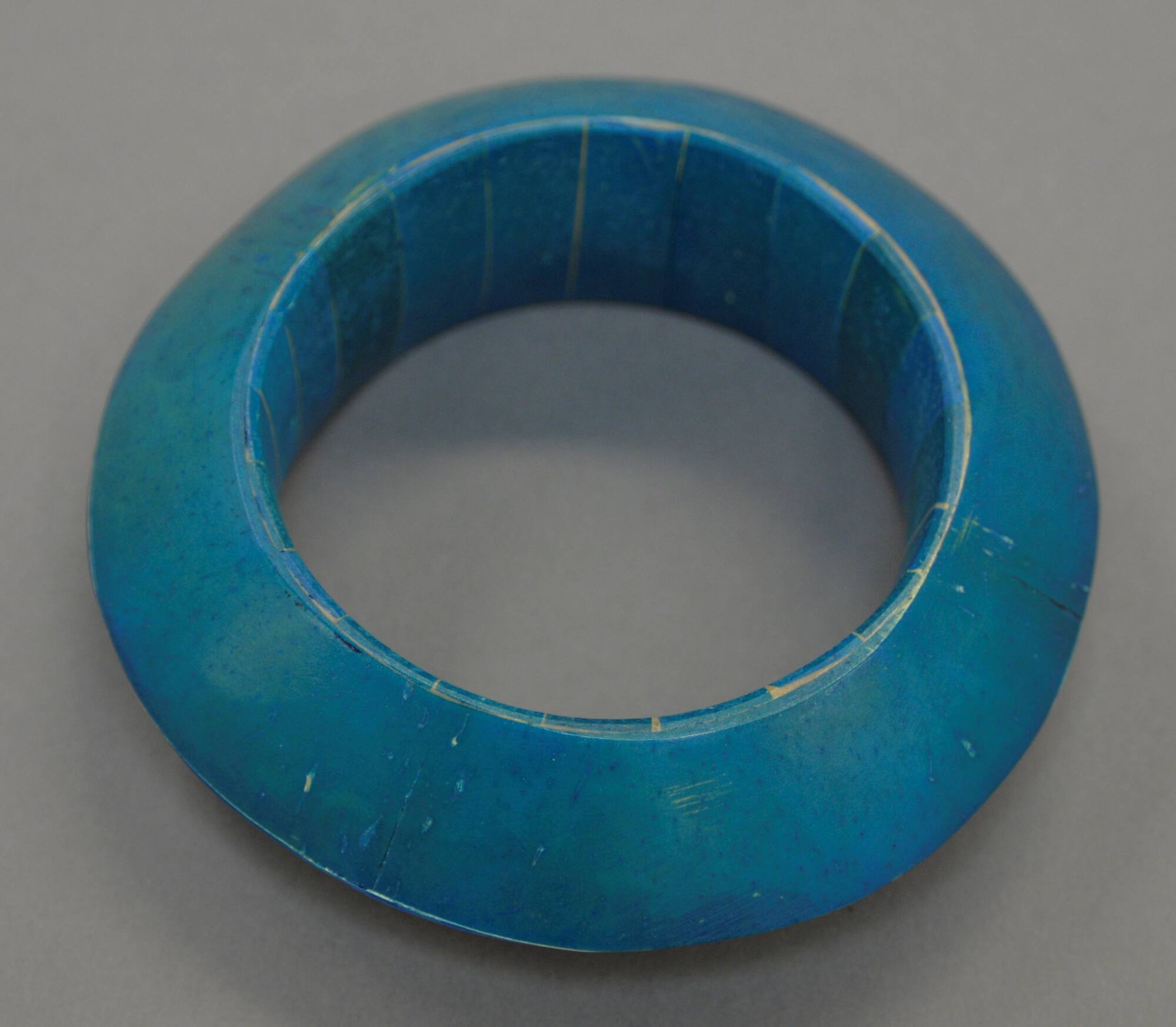 DescriptionBlue circular bangle made of coconut shell.