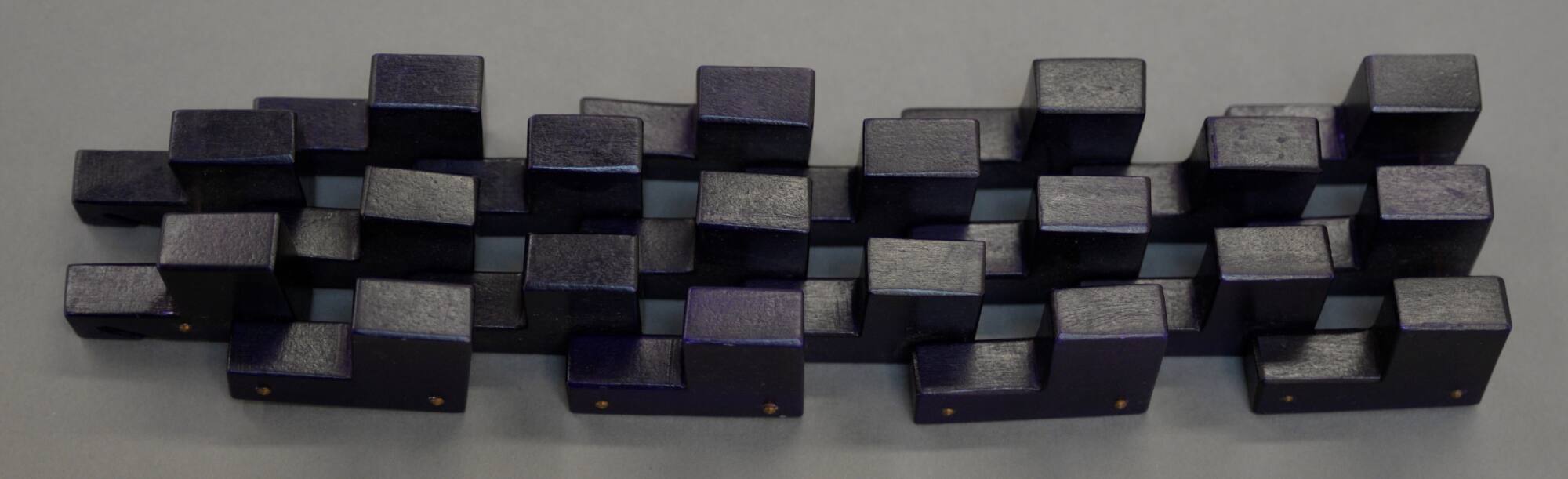 DescriptionA 2 1/4 inch wide geometric wooden bracelet composed of cubes of alternating heights.