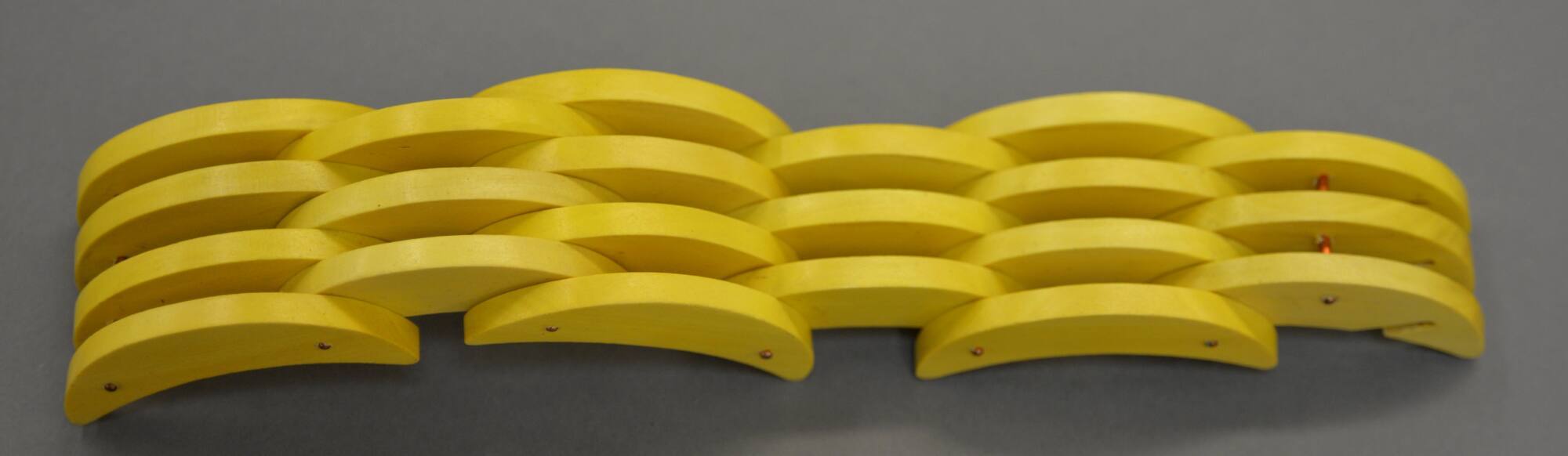 DescriptionA series of four yellowsemi-circles, flat sides facing down, interlaced with three yellow semi-circles, flat sides facing down, repeating.