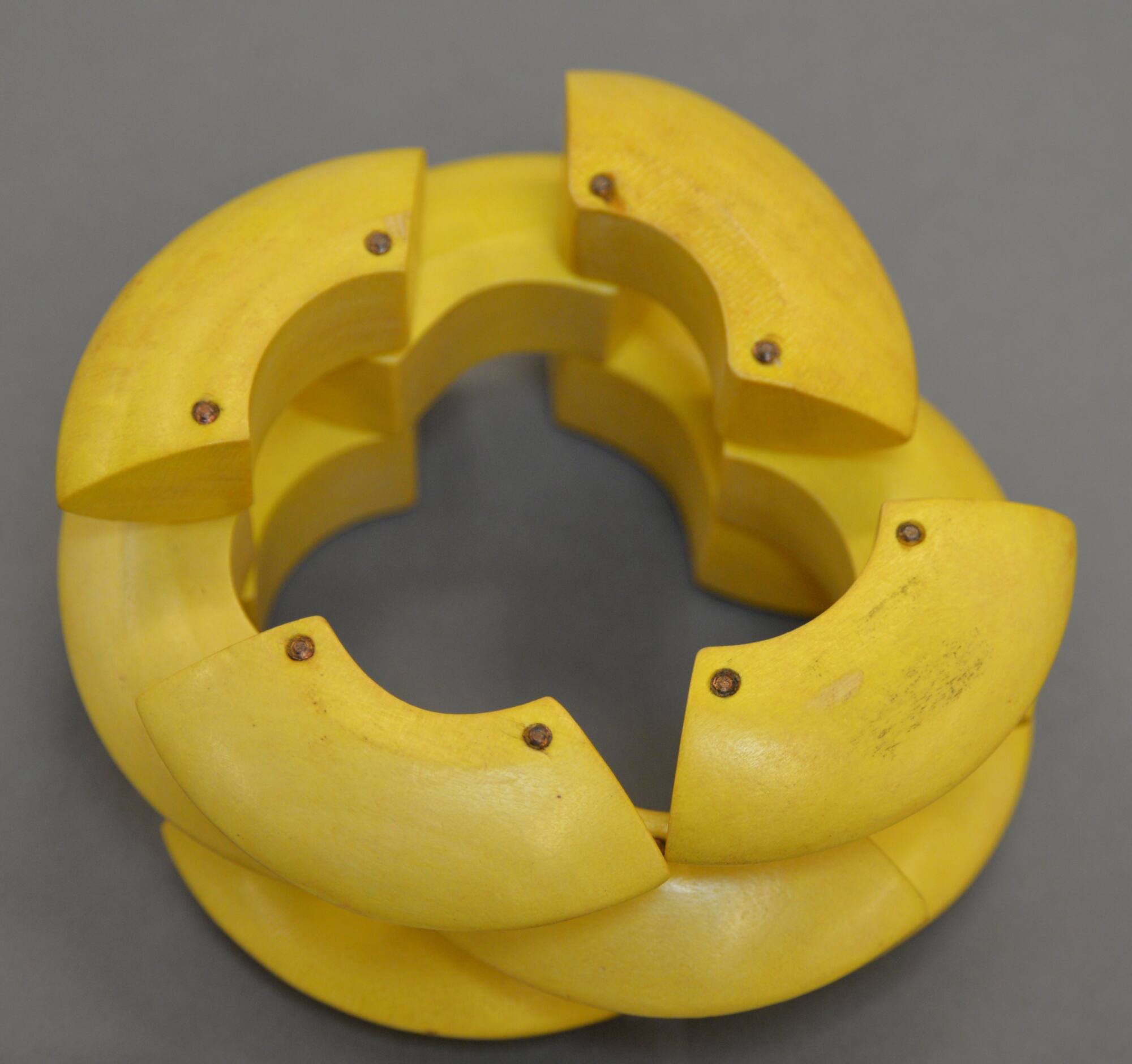 DescriptionYellow wooden bean-shaped forms in three rows, creating a bracelet.