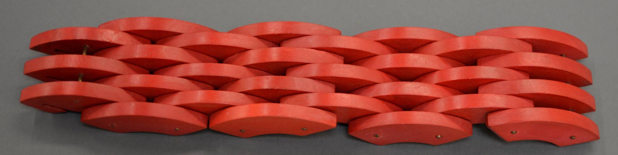 DescriptionAn orange wooden bracelet with pattern mimicing basket weave.