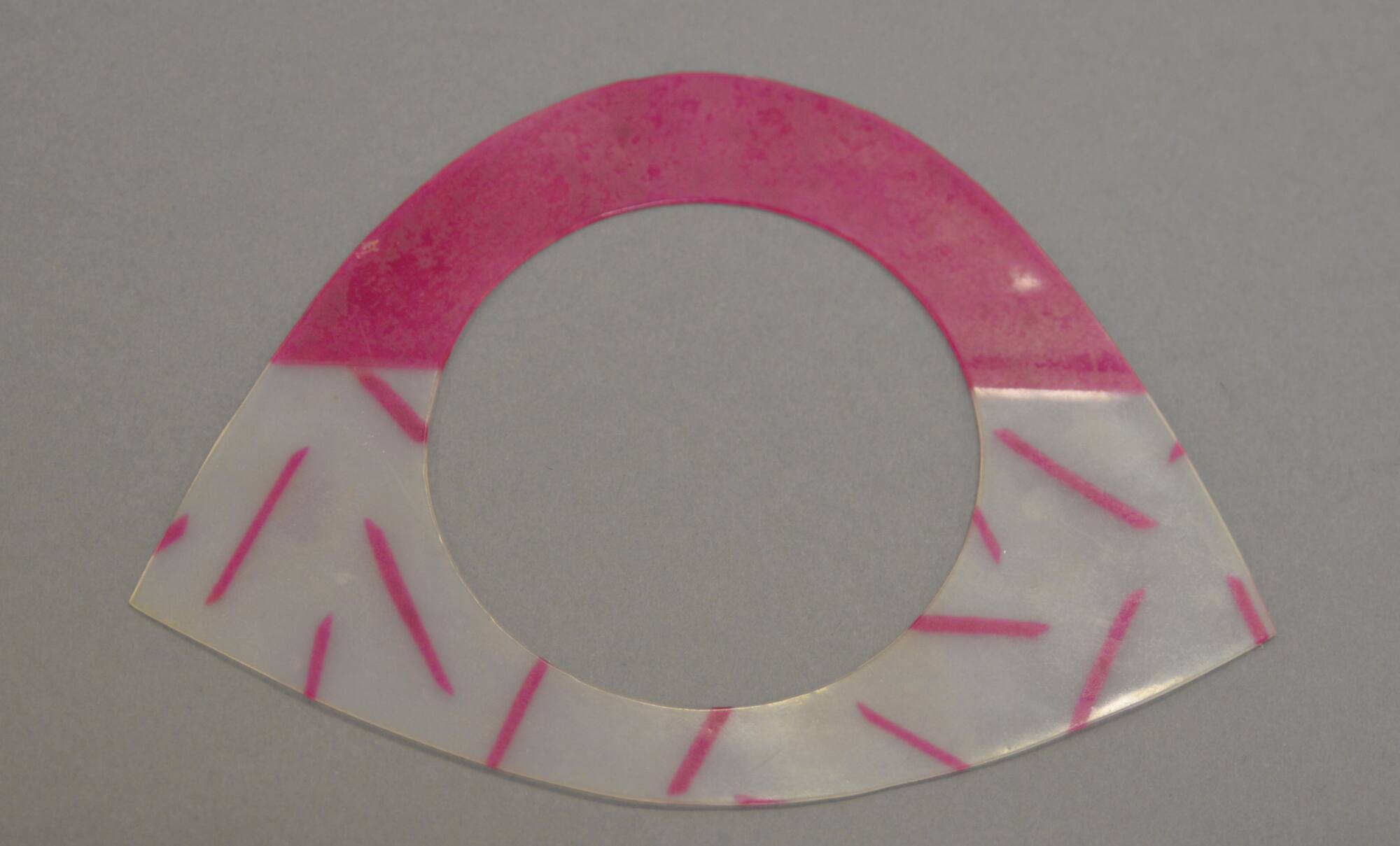 DescriptionFlat, plastic bracelet. One end is curved and solid pink. The other end has two points and is white with pink confetti-like stripes.