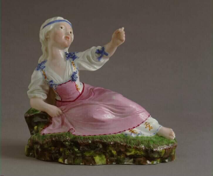 DescriptionFemale figure with pink skirt and white blouse with blue bows; blue headband in hair; leaning on right elbow, left hand raised; reclining on grassy mound.Published ReferencesKurt Röder and Michel Oppenheim. Das Höchster Porzellan auf der Jahrtausend-Ausstellung in Mainz 1925, exh. cat. (Mainz, Germany: L. Wilckens, 1930): nos. 536–537, p. 85; plate 89a (ill. [no. 536 only])