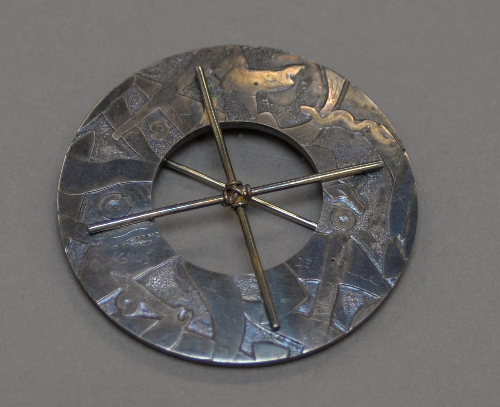 DescriptionA silver circular brooch with small sticks crossing over the front.Exhibition History