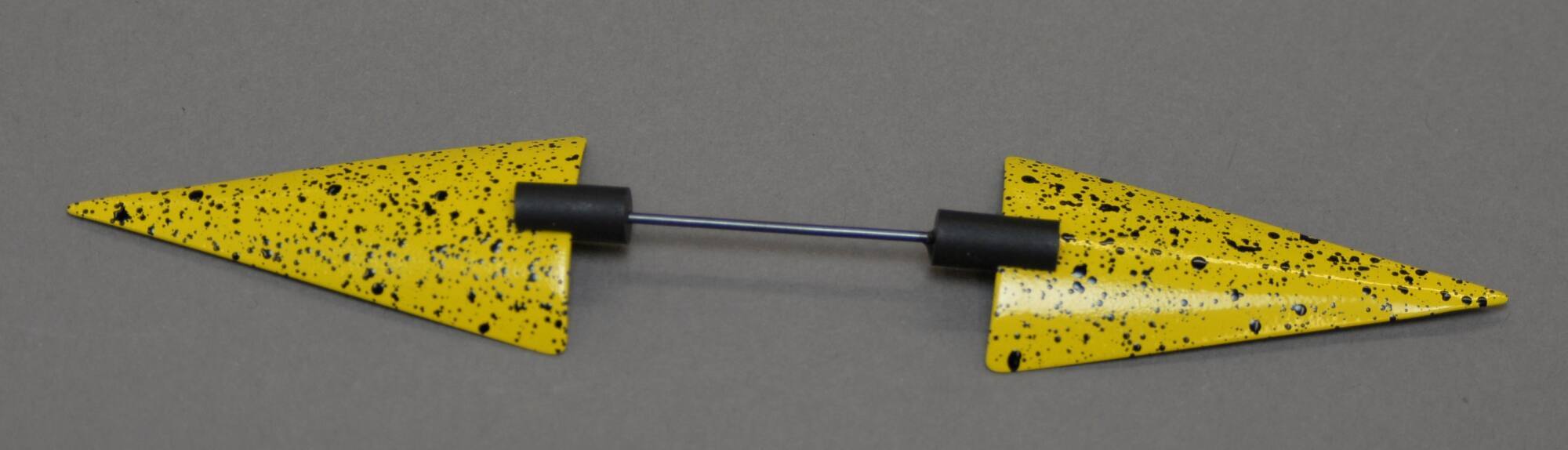 DescriptionA stick pin with triangles on either side, both yellow with black dots.