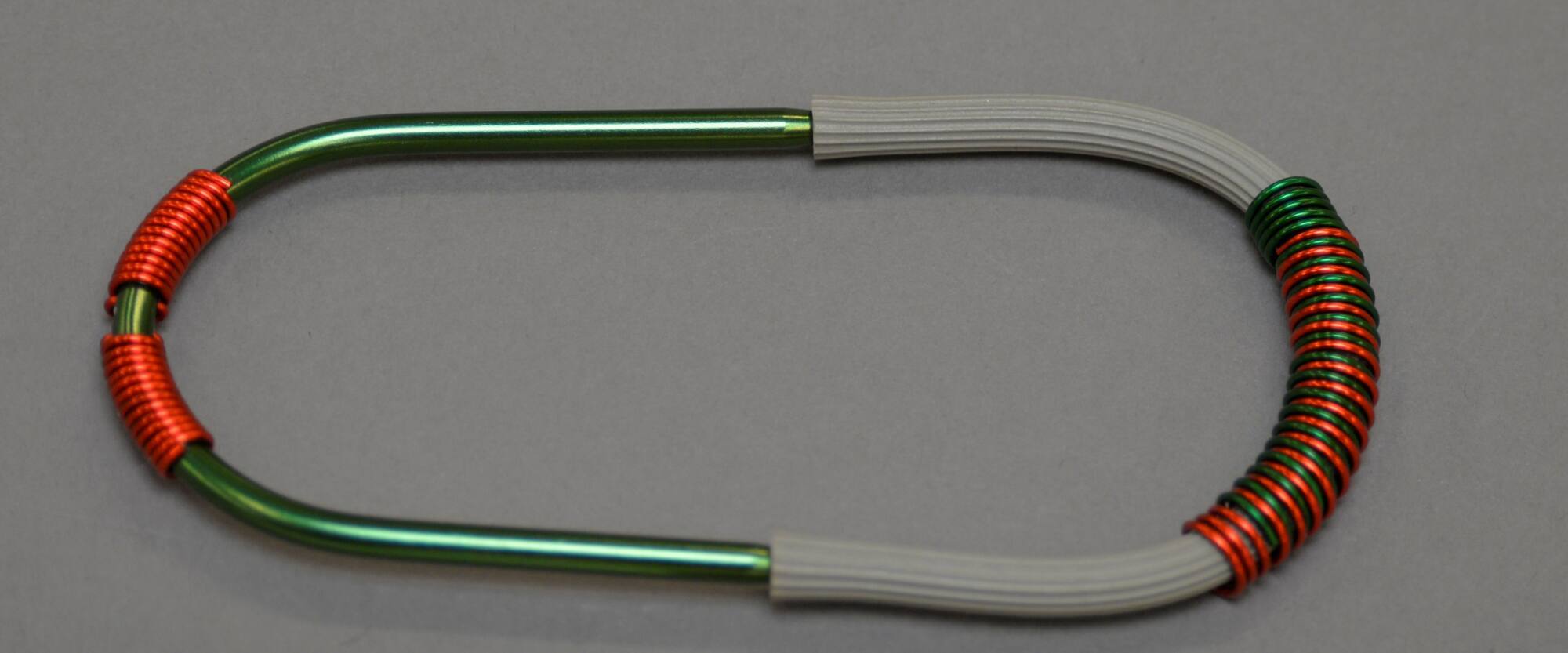 DescriptionA thick green metal rod, shaped into an oval and wrapped in red plastic at the top. The bottom half is covered in a grey plastic material with a section of and red and green alternating coils at the center bottom.