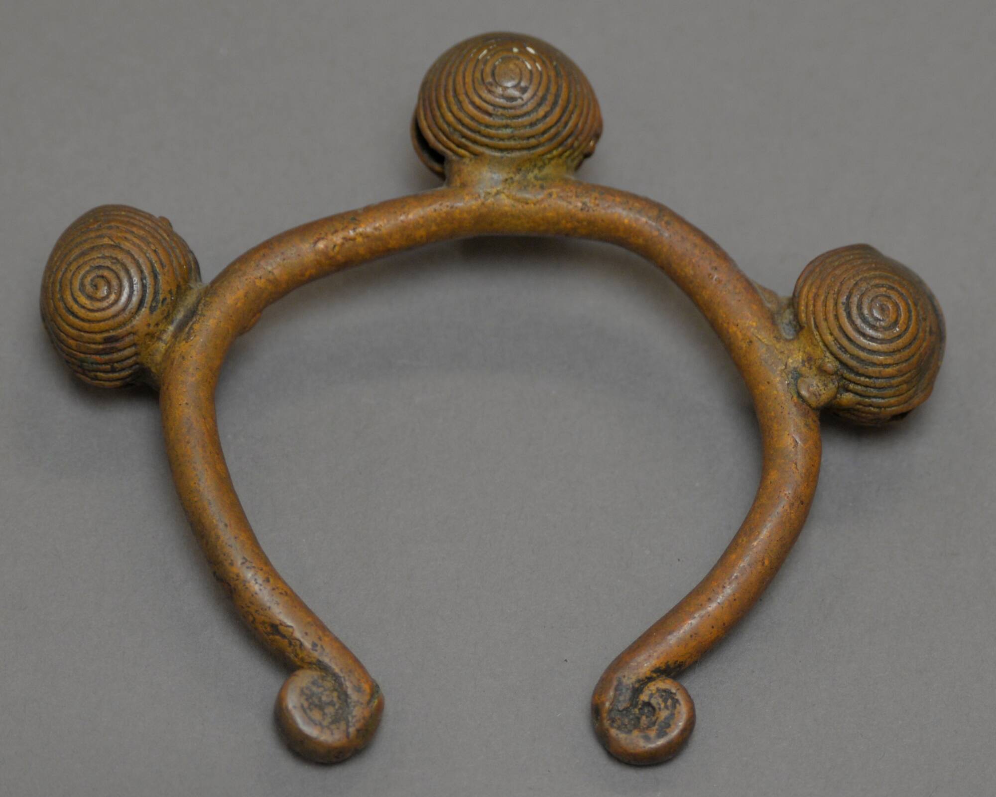 DescriptionA copper bangle with three coiled spheres around it, and the ends curled in small spirals.