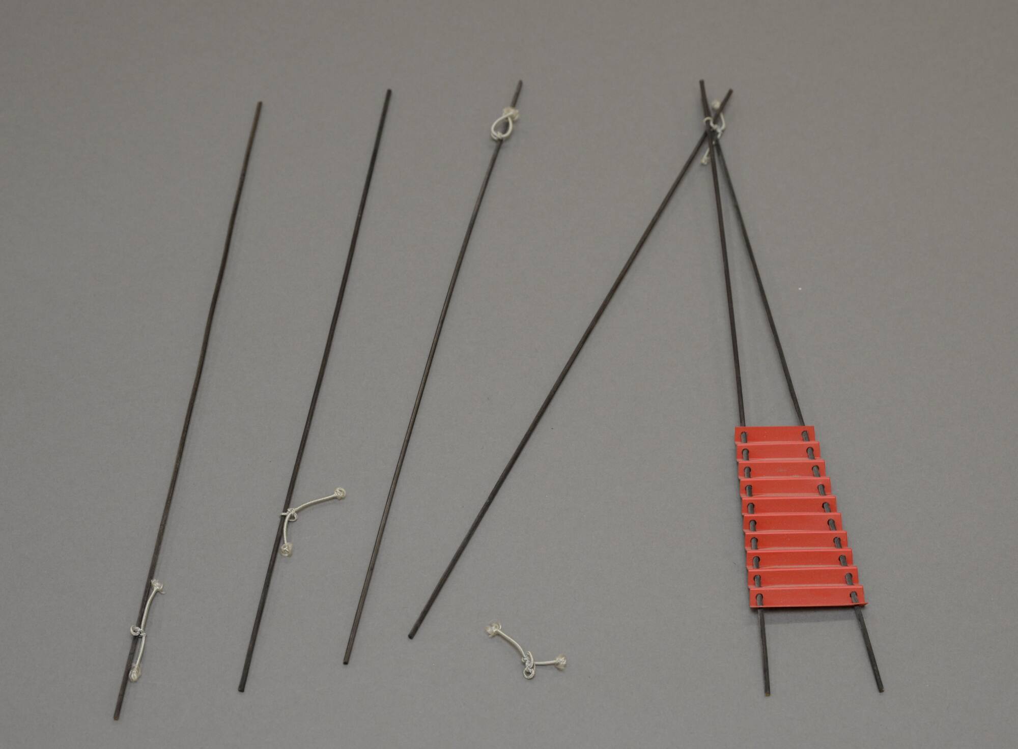 DescriptionA broken necklace made of thin black rods where two wood rods meet at one end to form a V-shape. The V-shape rods are laced through red paper in an accordian fold.Copyright© Paul Derrez