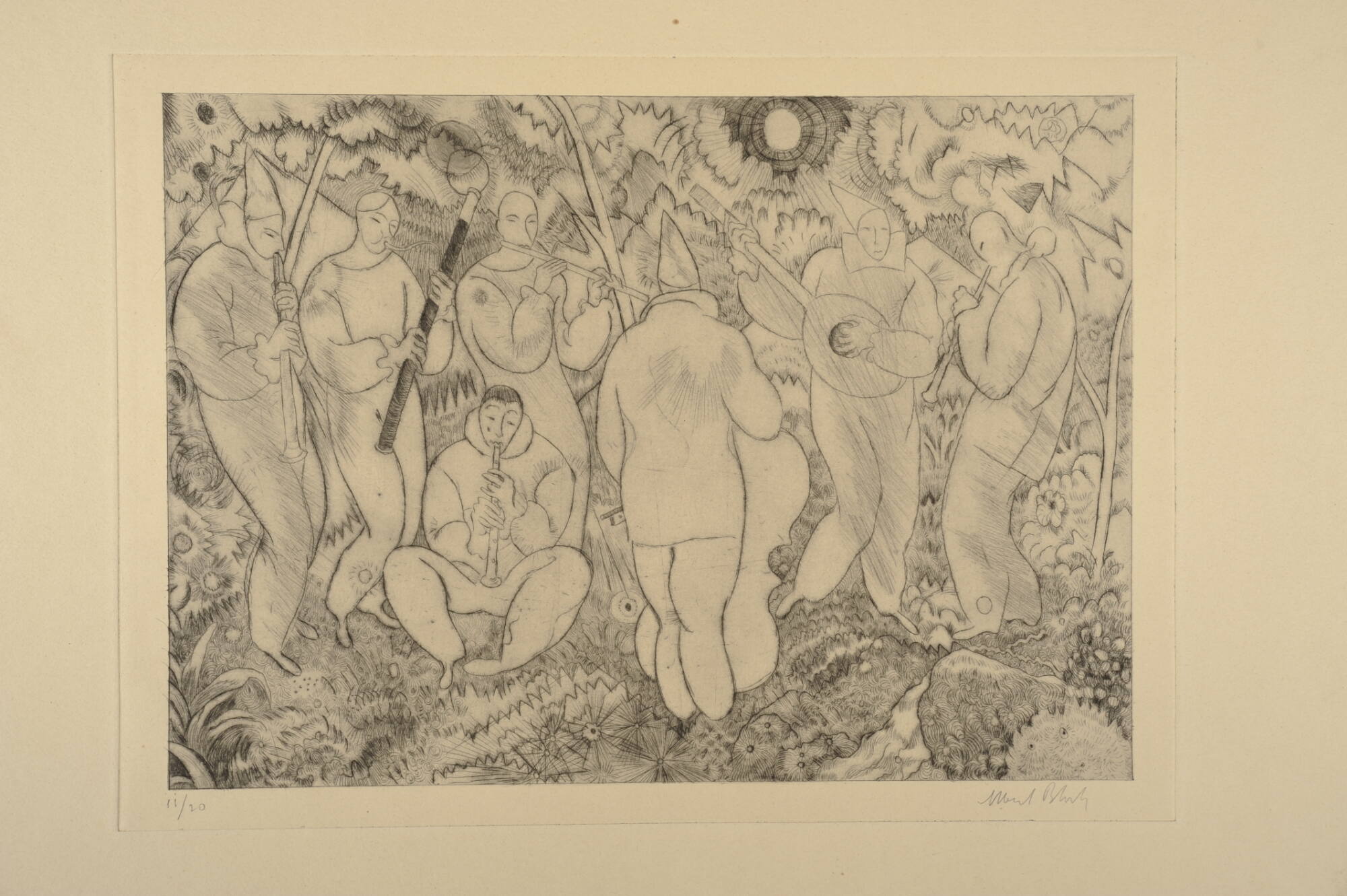 DescriptionThis horizontally oriented drypoint print depicts seven Pierrot-type figures in a lush setting animated by fanciful grasses, flowers, bushes, and trees all composed of minute, dense networks of lines. The Pierrot-like figures are bald-headed and pale-faced. Three wear cone-shaped hats, while all are attired in simple, plain, light-colored, loose costumes. Some of the seven figures have ruffles at the cuff and collars of their costumes, while others have ruffles only at the cuffs. Moving left to right: The first figure stands in a three-quarters pose and plays a clarinet-like instrument. The standing figure next to him plays a bassoon-like instrument. Seated to his right is another figure who plays a clarinet-like instrument. Behind him stands a figure who plays a flute. At the center of the composition, is a figure with his back turned to the viewer playing the upright bass. Continuing to move right across the scene, a figure plays a mandolin-like stringed instrument. To his right, near the right edge of the composition, the seventh figure stands in profile to the picture plane, facing left and playing a clarinet-like instrument. The musicians play by the light of a moon that casts a glow just right of center near the top edge of the scene.Exhibition HistoryNone
