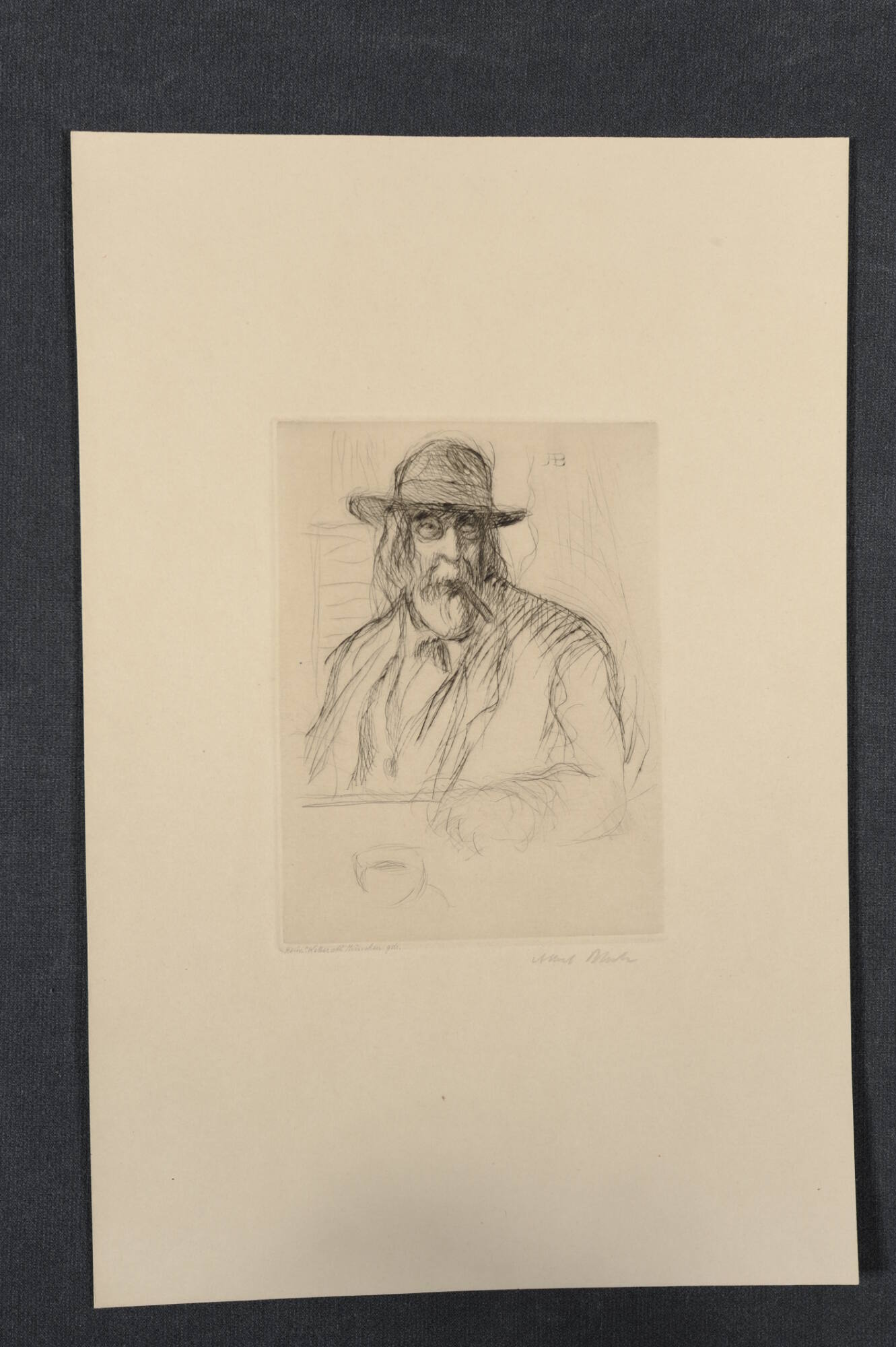 DescriptionUsing fine black lines, this vertically oriented drypoint print depicts an elderly man whose head and body from mid-torso up occupy the top two-thirds of the composition. The man wears a hat with a rounded crown and a small brim that casts a shadow over his eye as he gazes out towards the right. The man’s hair is long and falls to his shoulders. He has a beard and mustache and loosely holds a cigar between his lips. The cigar angles down towards the proper left lapel of the man’s jacket, which is worn over a vest and light-colored shirt. As smoke rises from his cigar, the man rests his proper left arm on the table directly in front of him, the surface of which extends to the lower edge of the composition. This arm is bent at the elbow and very summarily rendered. The hand is merely a blur of lines. Near the lower left edge of the image, within reach of the man, is an object that appears to be a coffee/tea cup atop a saucer. The monogram “AB” appears just to the right of the trail of cigar smoke near the upper edge towards the right side of the composition.Exhibition HistoryNone