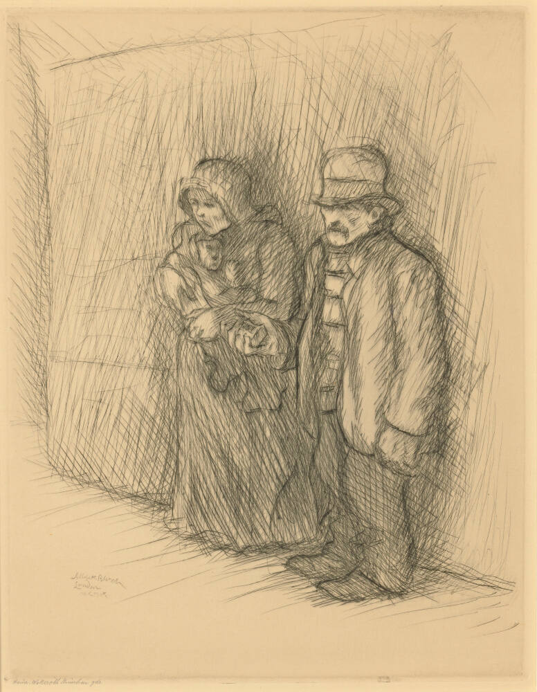 DescriptionUsing fine black lines, this vertically oriented drypoint print depicts at its center a woman holding a baby on the left and a man on the right. The woman wears a hat, coat, and long skirt that covers her shoes. She tightly holds the baby, wrapped in a blanket, against her. Its head rests on the woman’s proper right shoulder and is tucked just beneath her chin. The man whom she stands next to also wears a hat and sports a mustache. His coat is open to reveal a striped shirt. He wears dark colored pants and dark shoes. While his proper left arm hangs straight down at his side, his proper right arm is bent at the elbow at a 90-degree angle. The fingers of his hand curl around a small roughly rectangular object with an unintelligible inscription or label on it. Both figures lean again a wall. They wear far-off, dejected expressions. Near the lower left corner of the image is the inscription: “Albert Bloch / London / MCMIX”Exhibition HistoryNone