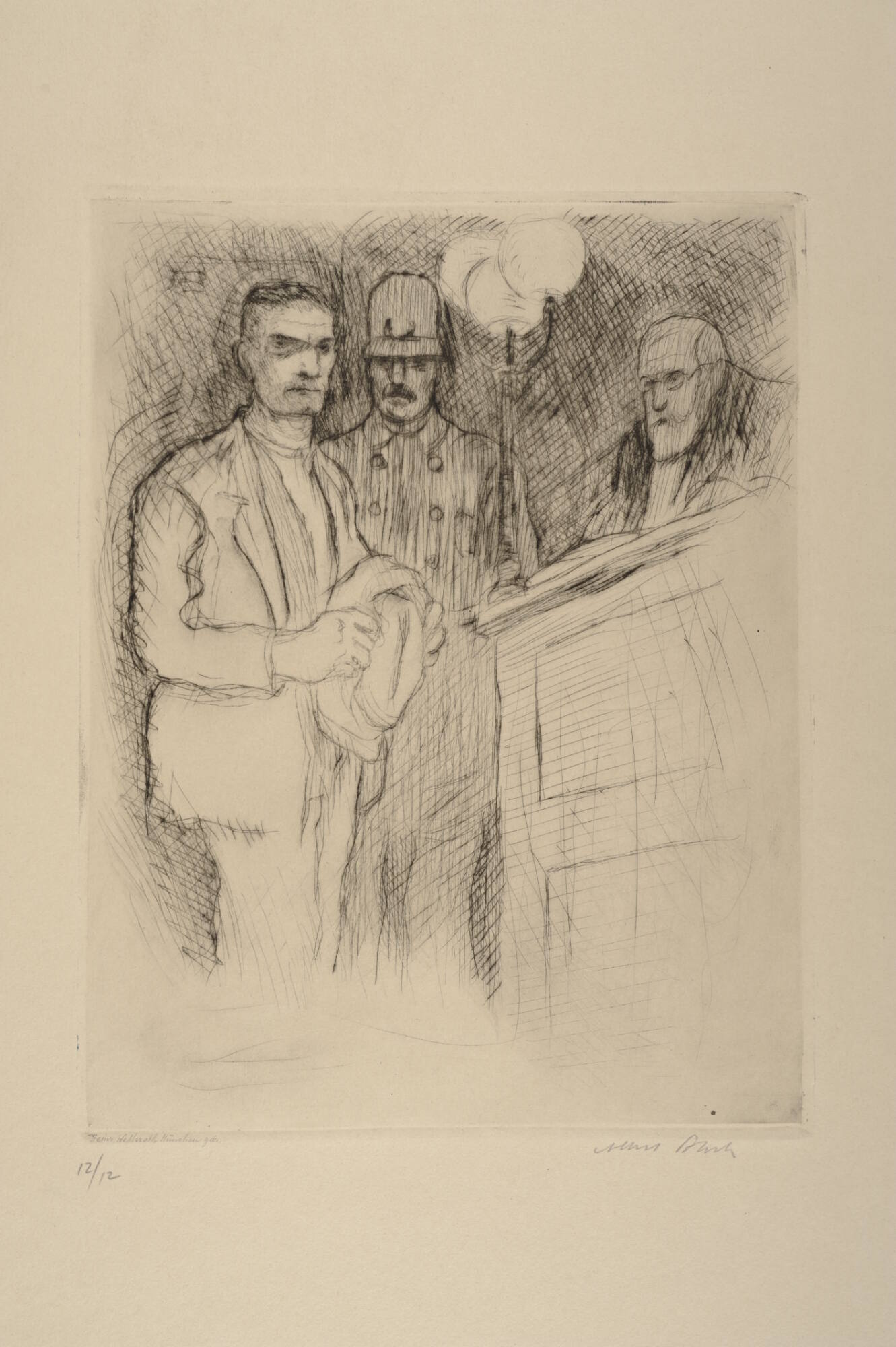 DescriptionUsing fine black lines, this vertically oriented drypoint print depicts three men against a dark, crosshatched background. The man standing in a three-quarters pose at the left side of the composition is depicted from the knees up. He wears a light-colored jacket and pants and holds his hat out in front of his torso with both hands. He has short hair, a five-o’clock shadow, and wears a pensive expression. Standing just slightly behind him at the center of the composition is a mustachioed man who wears a uniform, the jacket of which has a double row of buttons down the front. His wears a hat with a domed crown and a u-shaped insignia just above the small brim. At the right side of the image, a third man sits behind a tall desk with a three-globed lap on its corner closest to the uniformed man. The man behind the desk wears a dark jacket with a light shirt or tie. He has glasses and light colored hair and beard. His gaze is directed at the man opposite him—the one clenching his hat in his hands. The print includes the monogram “AB” in the upper left corner.Exhibition HistoryNone