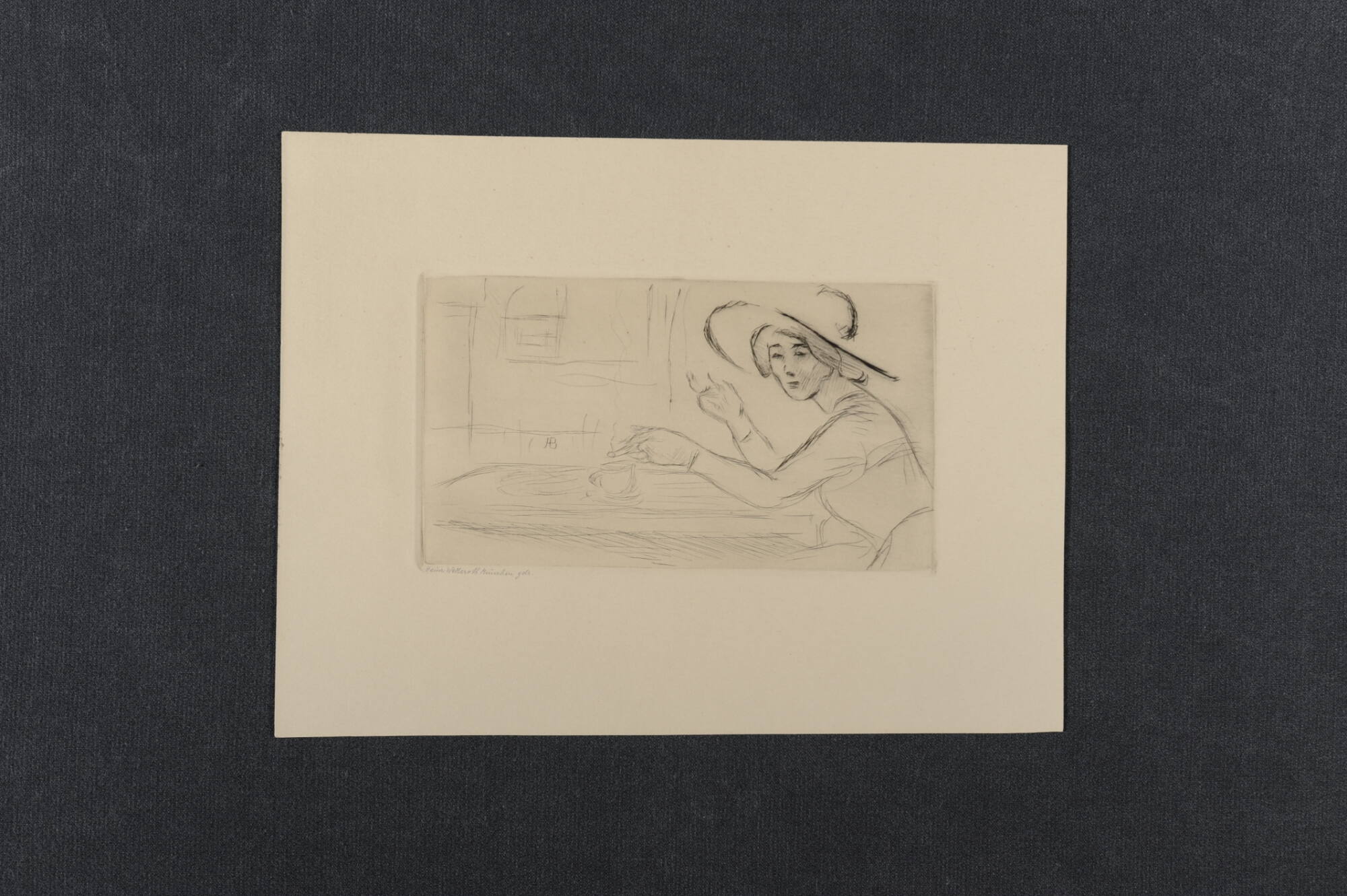 DescriptionUsing fine black lines, this horizontally oriented drypoint print features at its right side a woman seated at a table. She is depicted from the waist up, wears a large brimmed hat that casts a shadow across her face, and looks over her proper left shoulder out at the viewer. Both of her elbows rest on the summarily rendered table top as she leans slightly forward. She gestures with her proper right hand—thumb and index finger extended while the other three fingers curl towards her palm. In her proper left hand, she holds a cigarette from which a thin double trail of smoke extends vertically up to top edges of the composition. Her hand and the cigarette are position just above a coffee/tea cup (the handle of which extends towards the left) resting on a saucer. The environment in which the woman sits, in a café, perhaps, and before a window, is very sketchily rendered and suggested only by a few lines in the upper left section of the image. The composition is inscribed with the monogram “AB” just slightly above and to the left of the coffee/tea cup.Exhibition HistoryNone